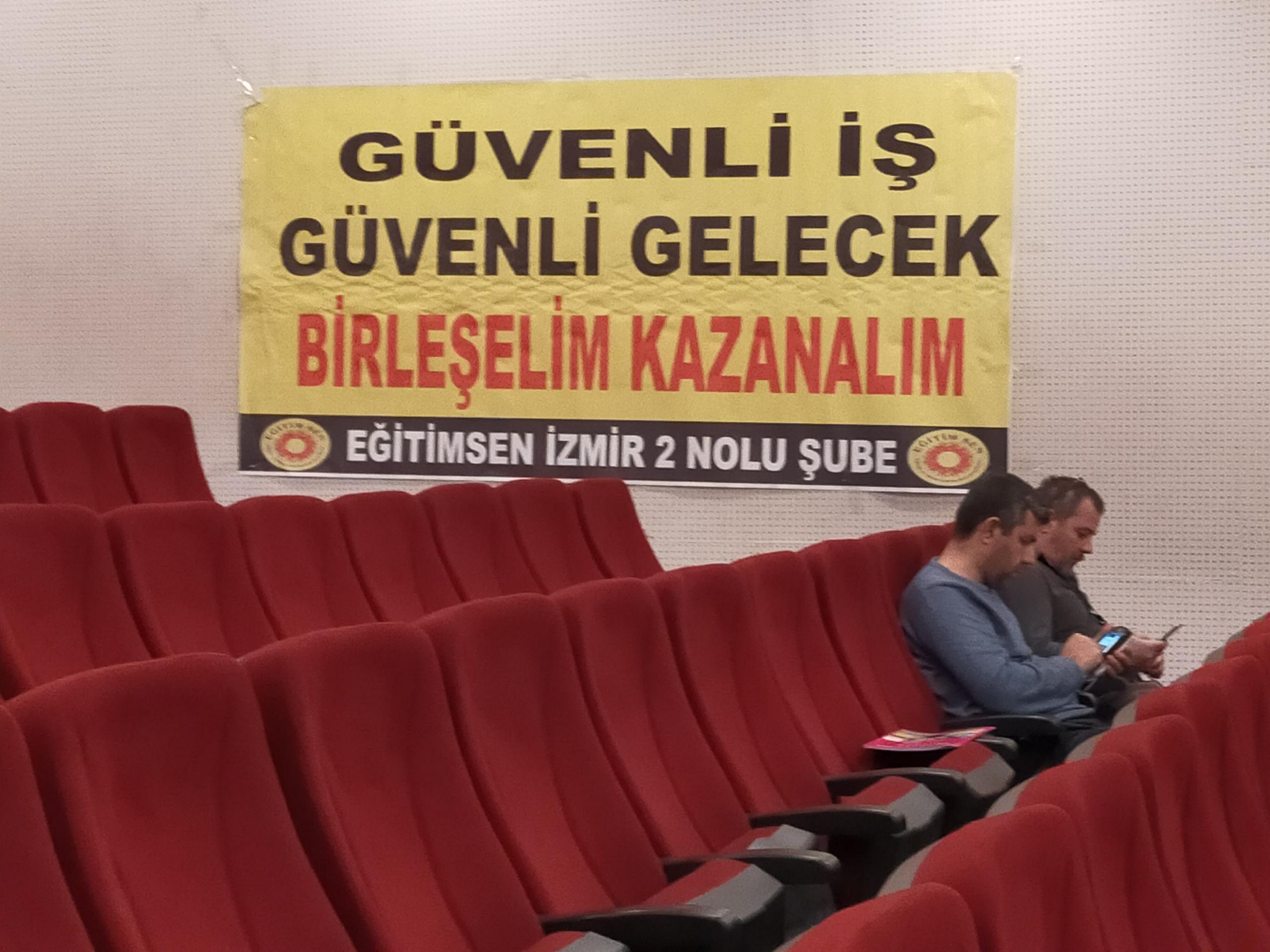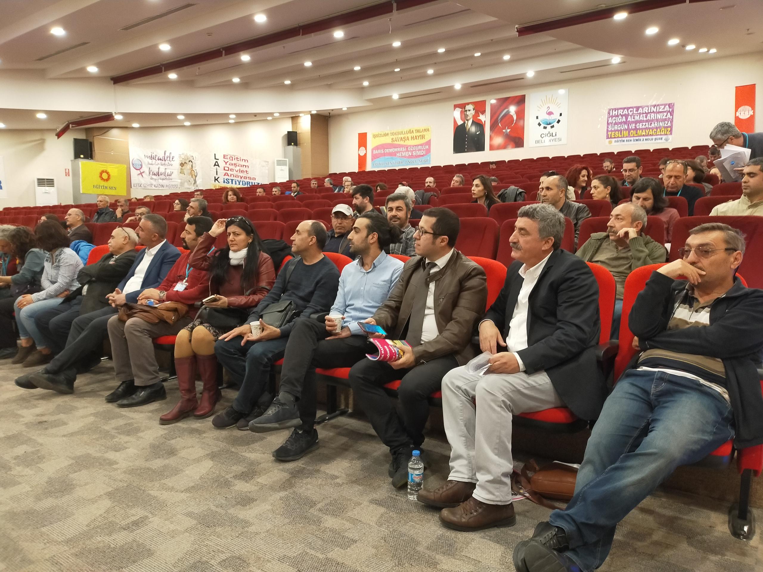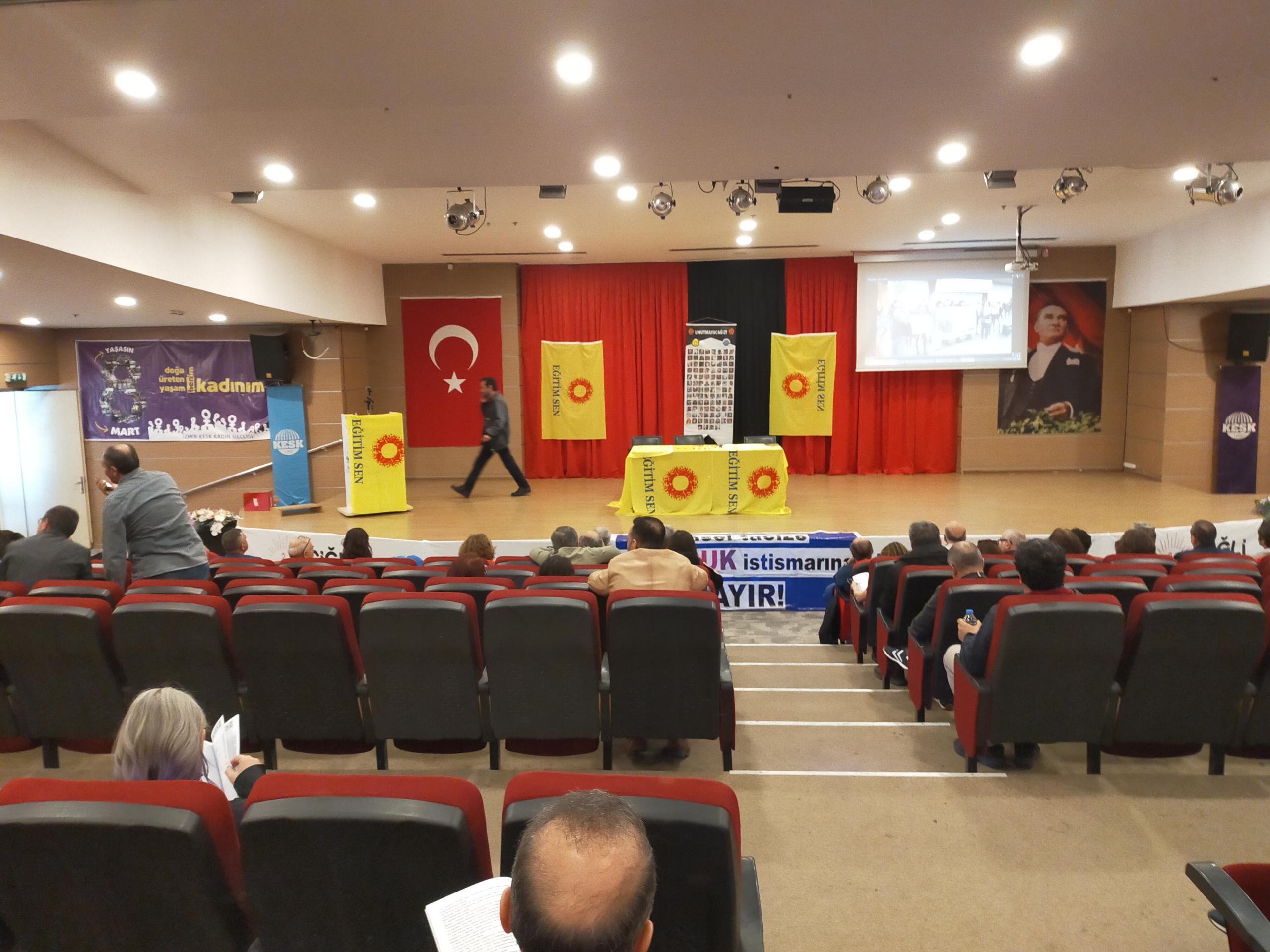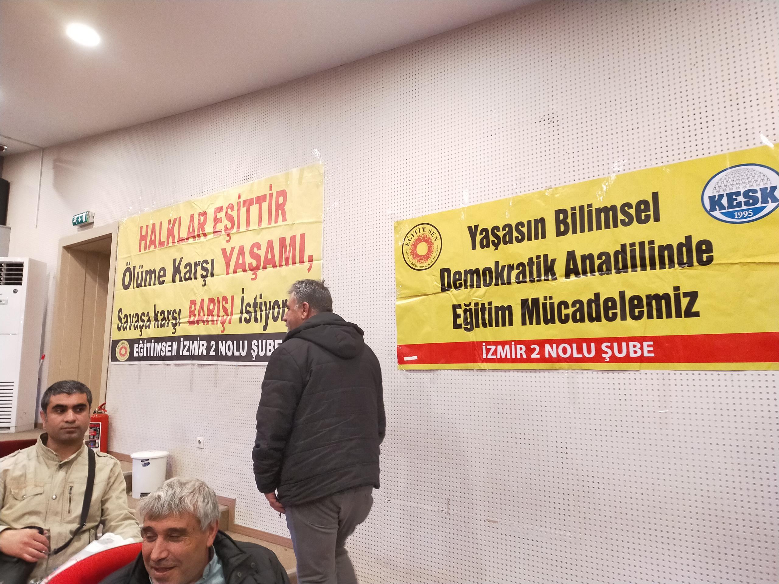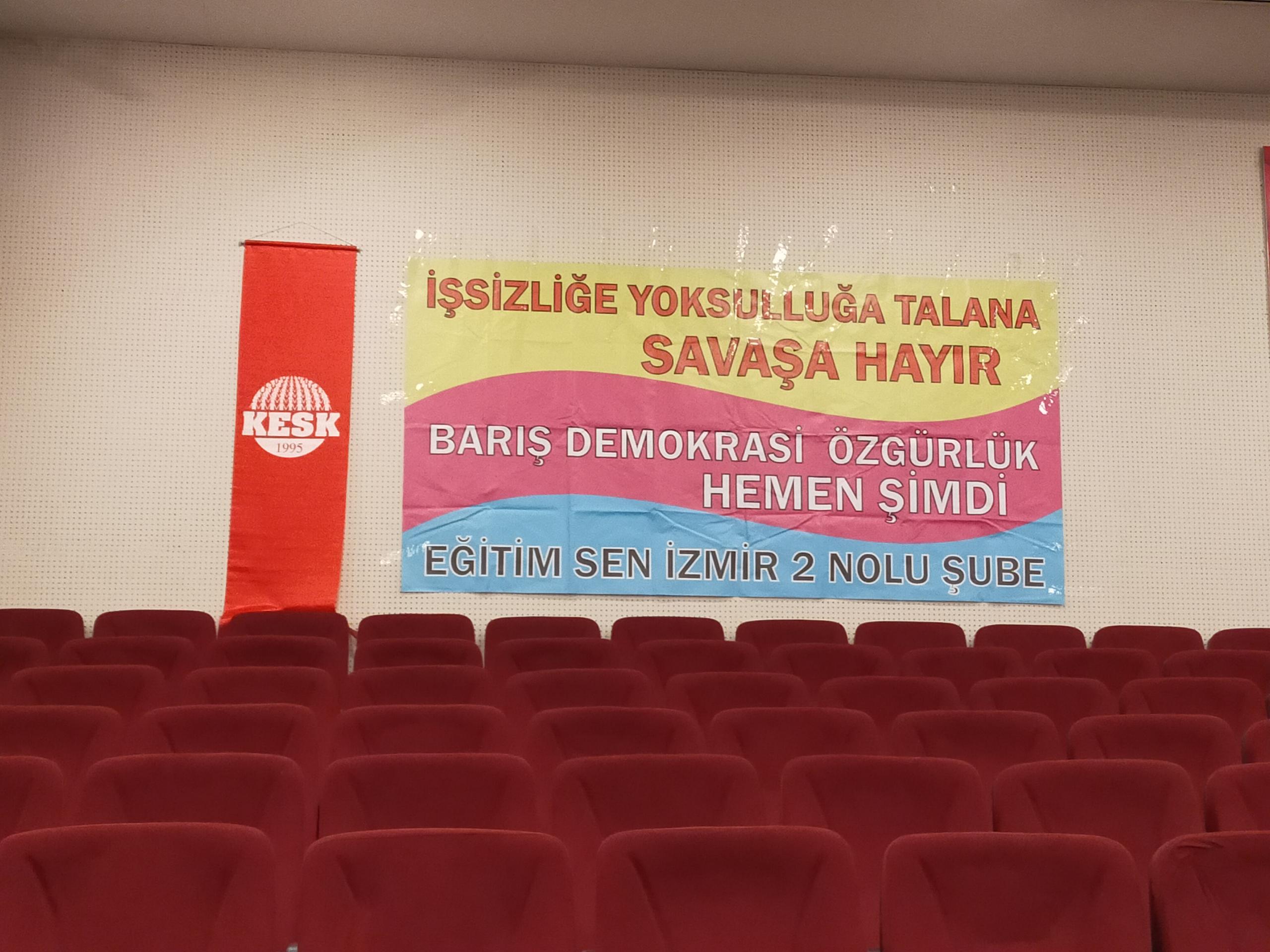 Eğitim-Sen İzmir 2 No’lu Şube’nin 11. Olağan Genel Kurulu gerçekleştirildi. Genel kurulun yapıldığı salona ‘Yaşasın bilimsel demokratik anadilde eğitim mücadelemiz, halklar eşittir ölüme karşı yaşamı savaşa karşı barışı istiyoruz, yaşamdan ihraç edemeyeceksiniz işimize geri döneceğiz, işsizliğe yoksulluğa talana savaşa hayır’ pankartları asıldı.