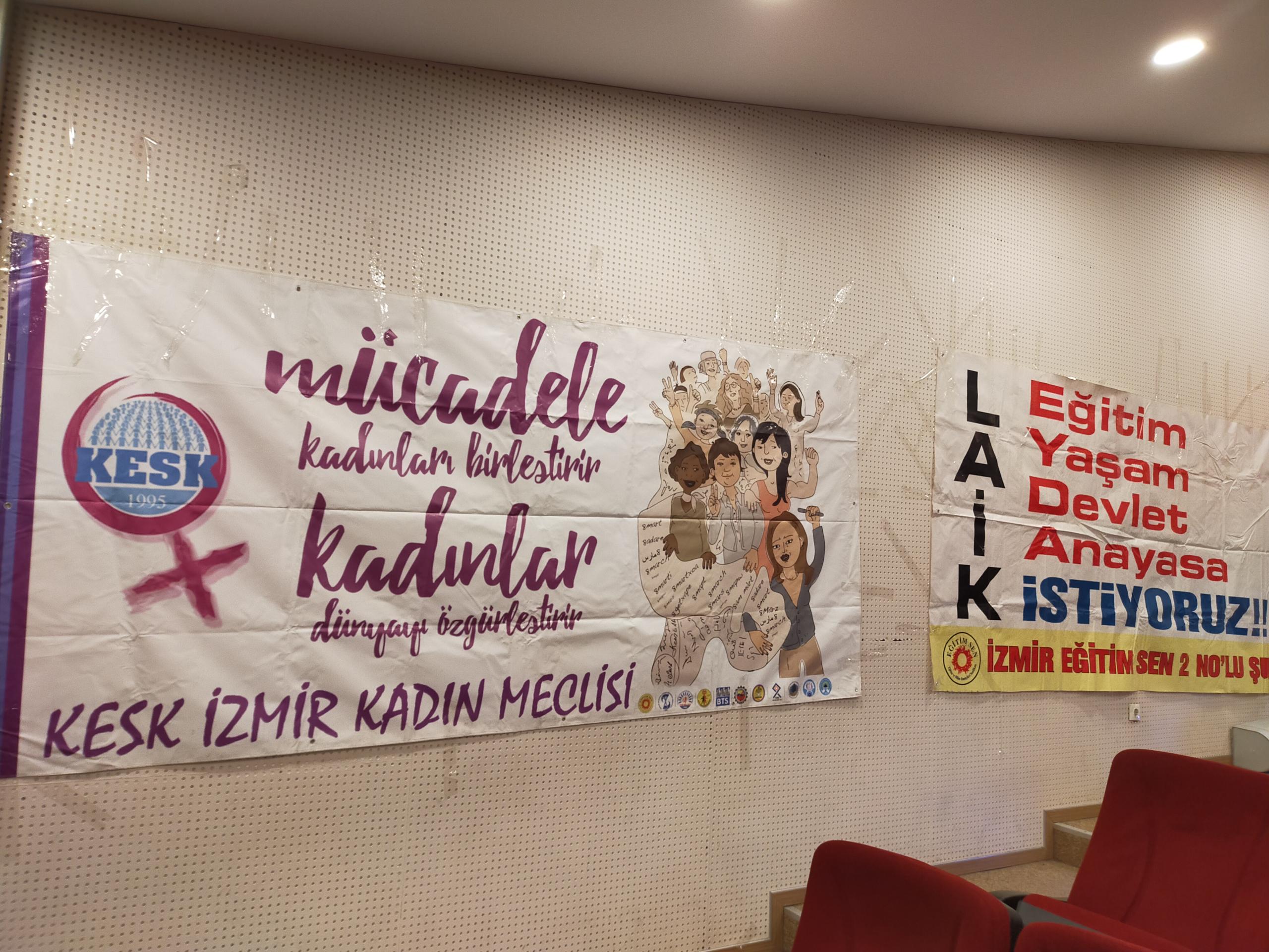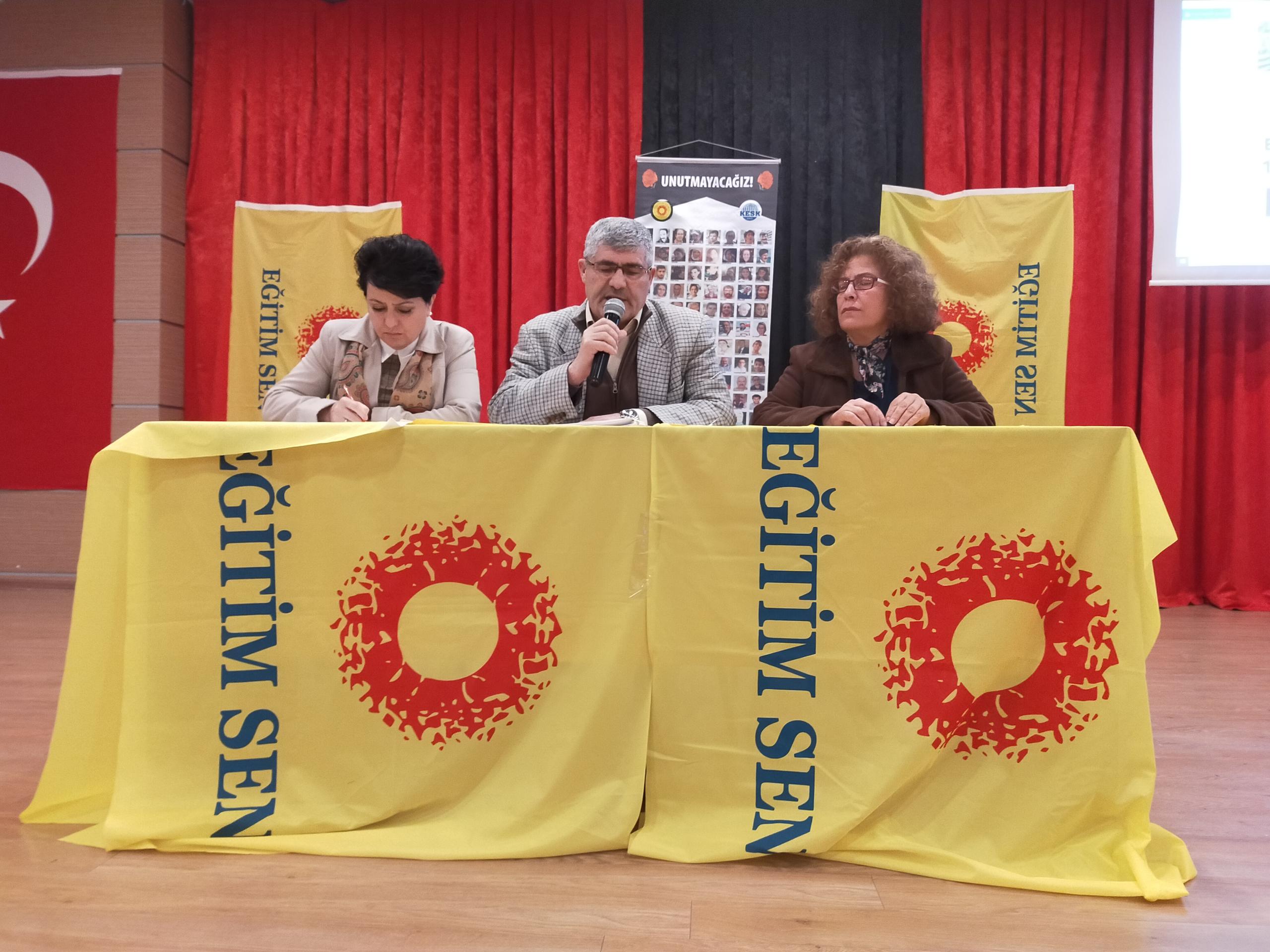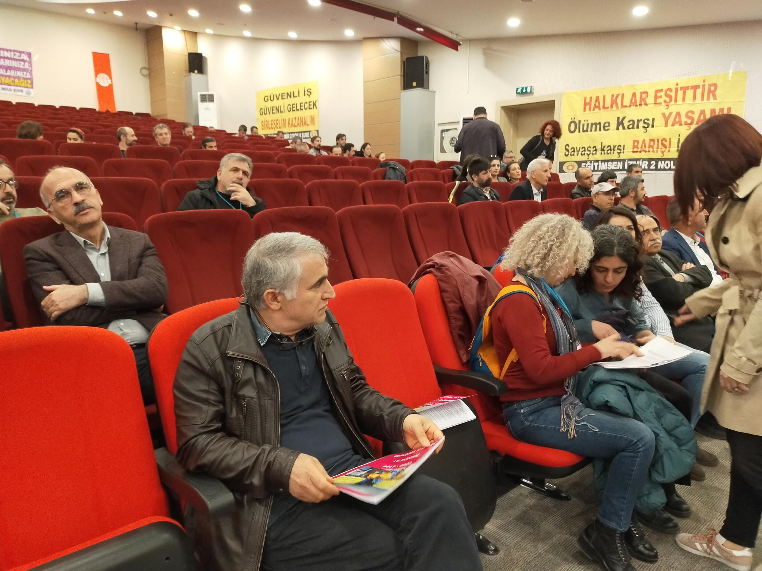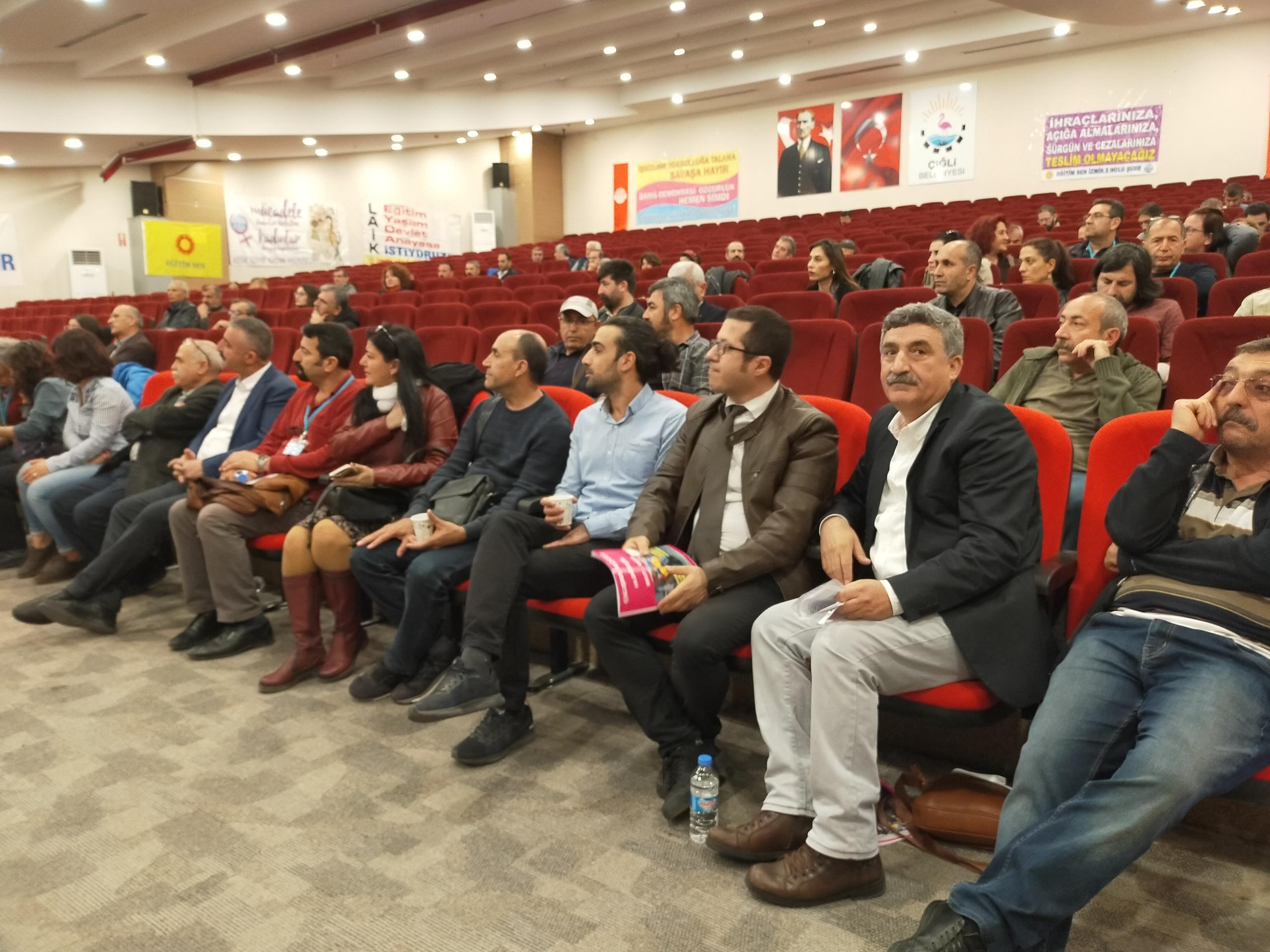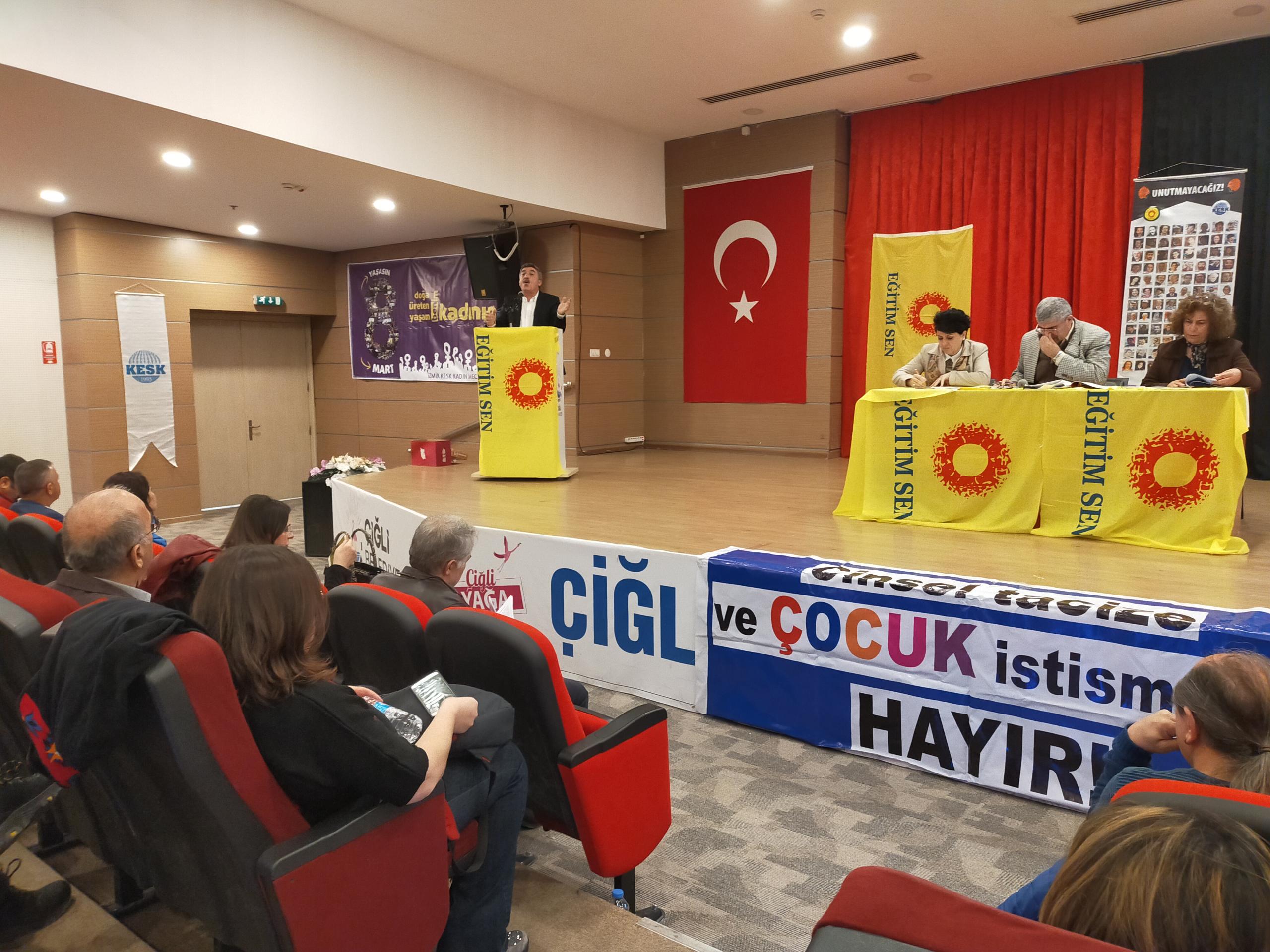 Eğitim-Sen İzmir 2 No’lu Şube’nin 11. Olağan Genel Kurulu gerçekleştirildi. Genel kurulun yapıldığı salona ‘Yaşasın bilimsel demokratik anadilde eğitim mücadelemiz, halklar eşittir ölüme karşı yaşamı savaşa karşı barışı istiyoruz, yaşamdan ihraç edemeyeceksiniz işimize geri döneceğiz, işsizliğe yoksulluğa talana savaşa hayır’ pankartları asıldı.
