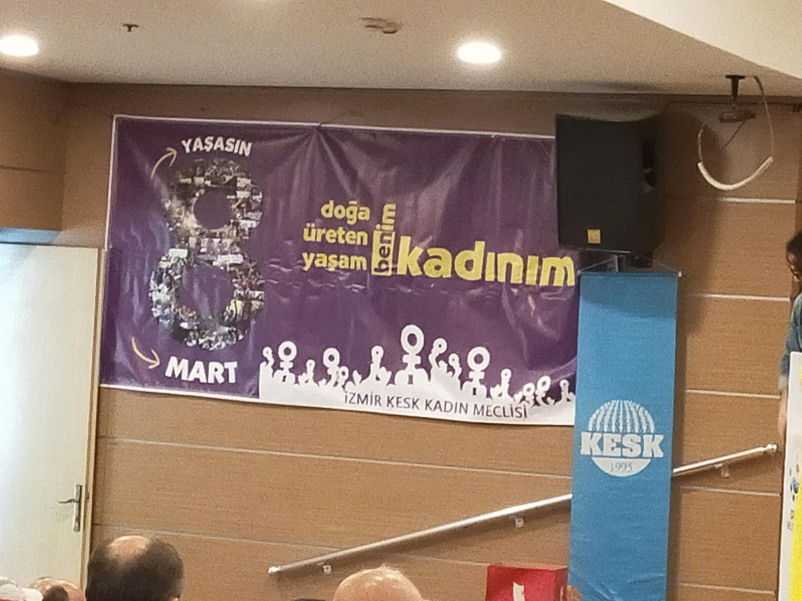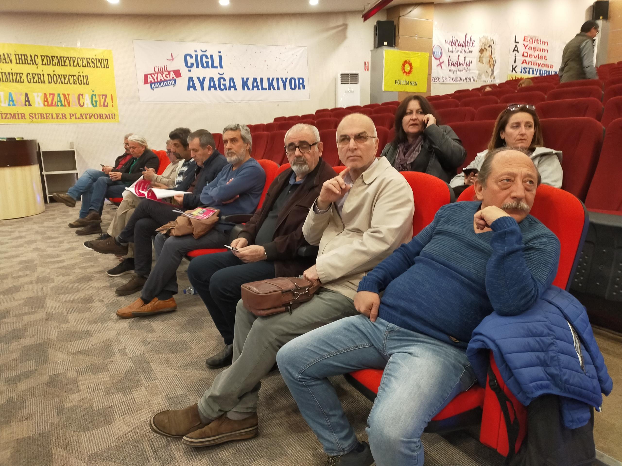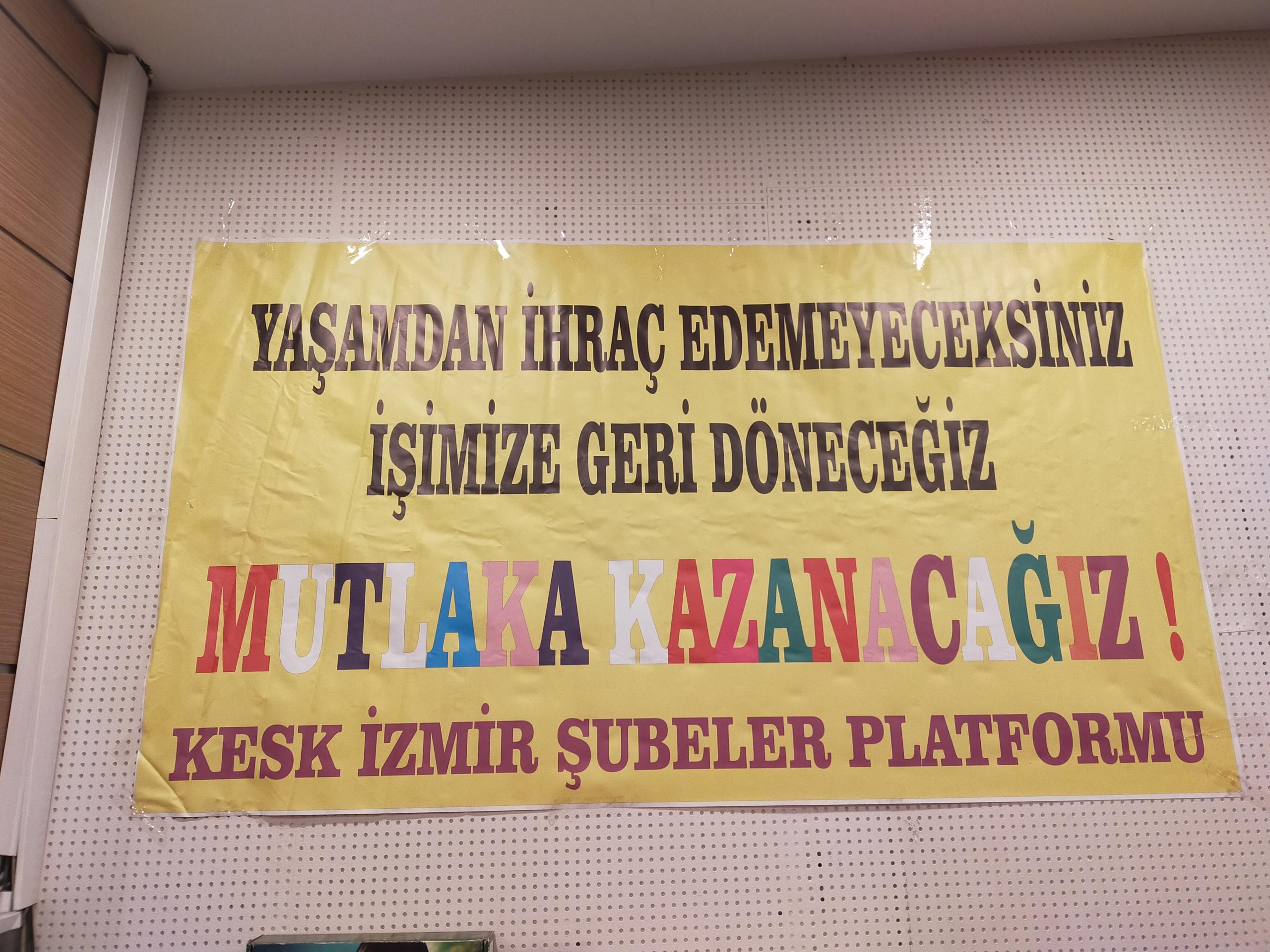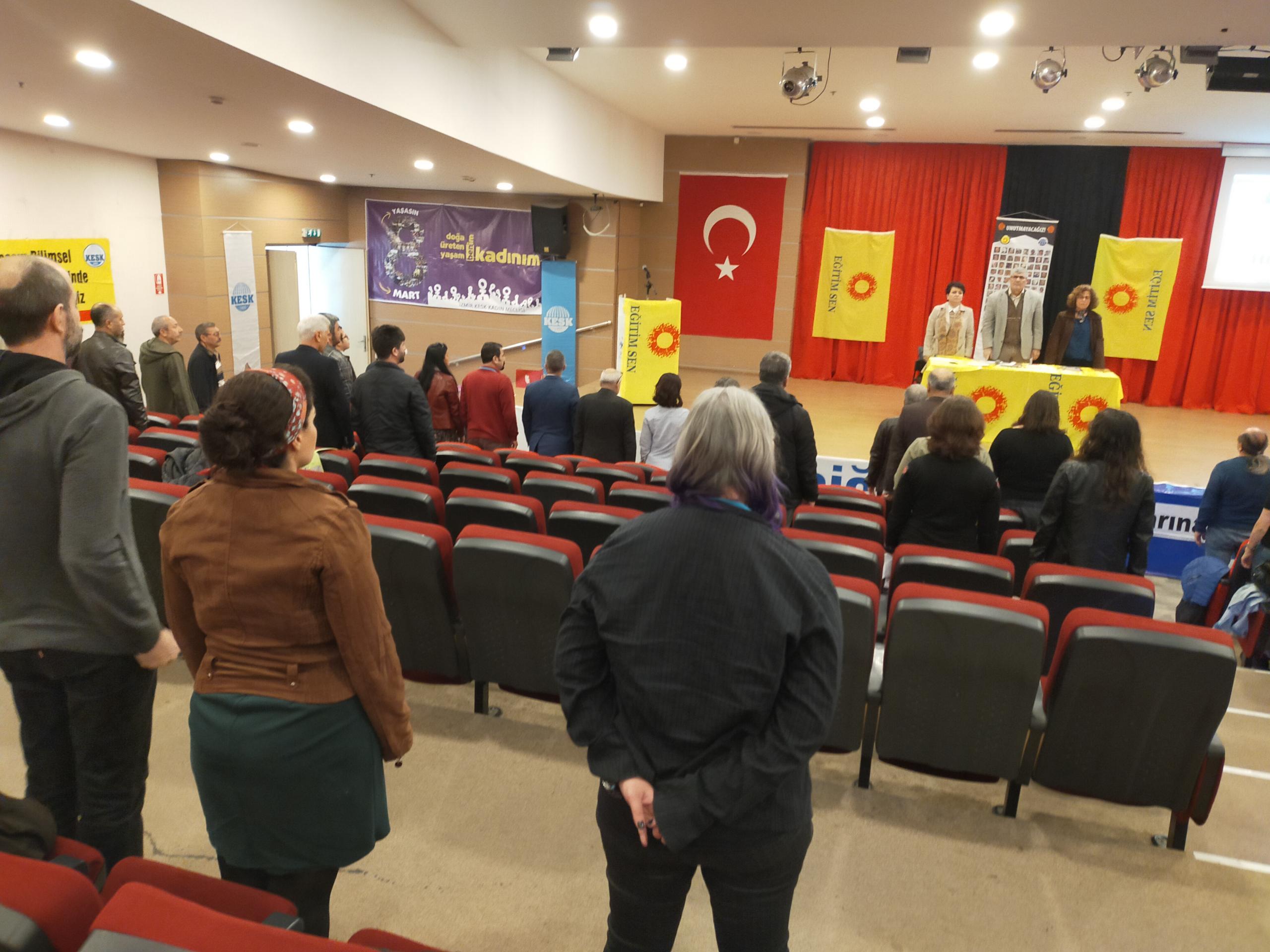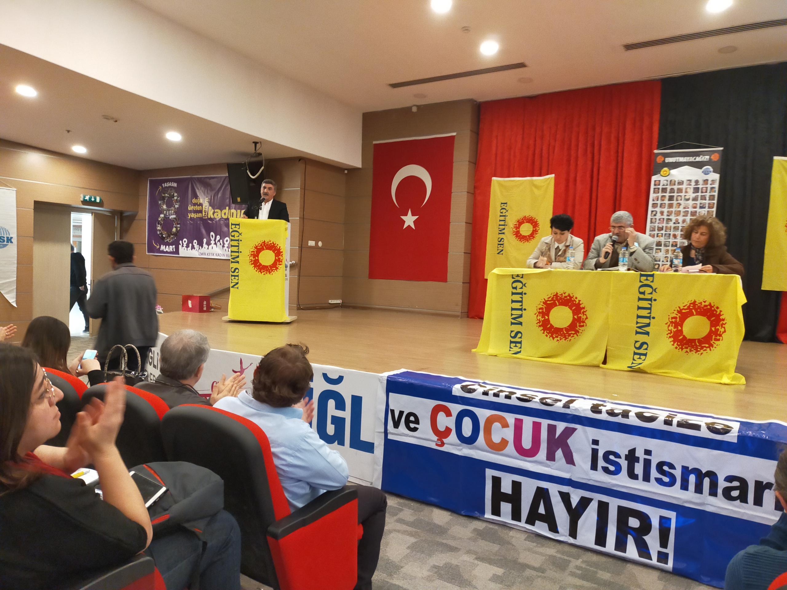Eğitim-Sen İzmir 2 No’lu Şube’nin 11. Olağan Genel Kurulu gerçekleştirildi. Genel kurulun yapıldığı salona ‘Yaşasın bilimsel demokratik anadilde eğitim mücadelemiz, halklar eşittir ölüme karşı yaşamı savaşa karşı barışı istiyoruz, yaşamdan ihraç edemeyeceksiniz işimize geri döneceğiz, işsizliğe yoksulluğa talana savaşa hayır’ pankartları asıldı.