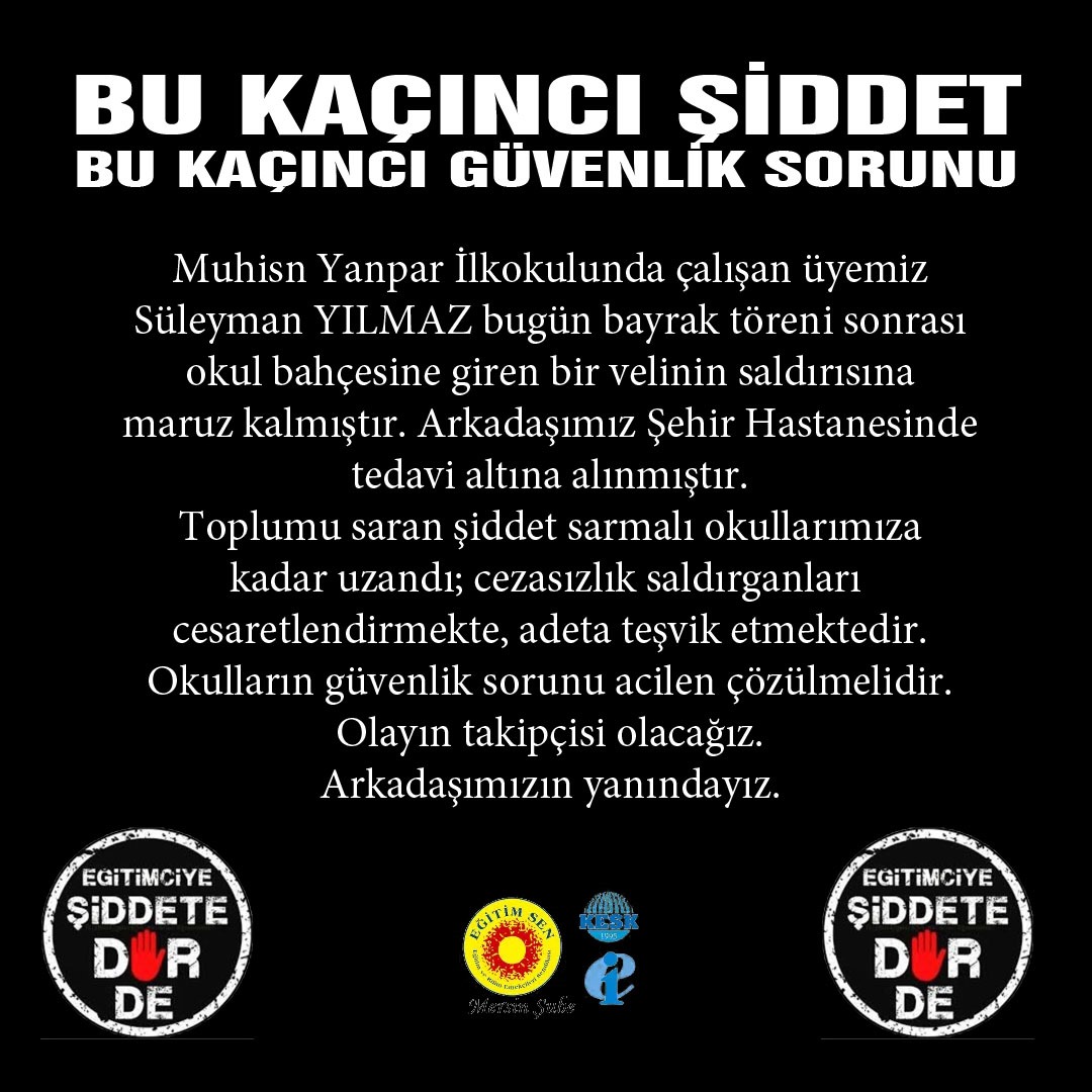 “Muhsin Yanpar İlkokulunda çalışan üyemiz Süleyman Yılmaz, bugün bayrak töreni sonrası okul bahçesine giren bir velinin saldırısına maruz kalmıştır. Arkadaşımız Şehir Hastanesinde tedavi altına alınmıştır. Toplumu saran şiddet sarmalı okullarımıza kadar uzandı; cezasızlık saldırganları cesaretlendirmekte, adeta teşvik etmektedir. Okulların güvenlik sorunu acilen çözülmelidir. Olayın takipçisi olacağız. Arkadaşımızın yanındayız”