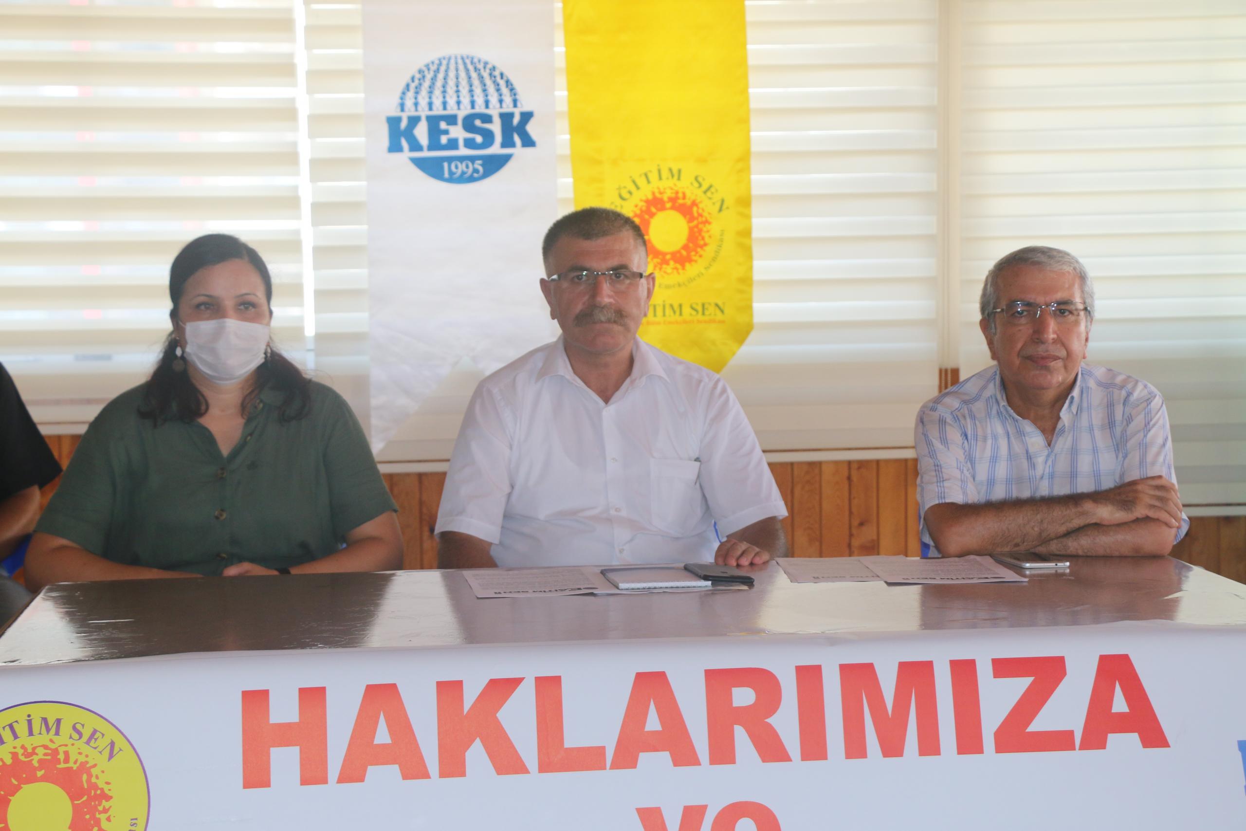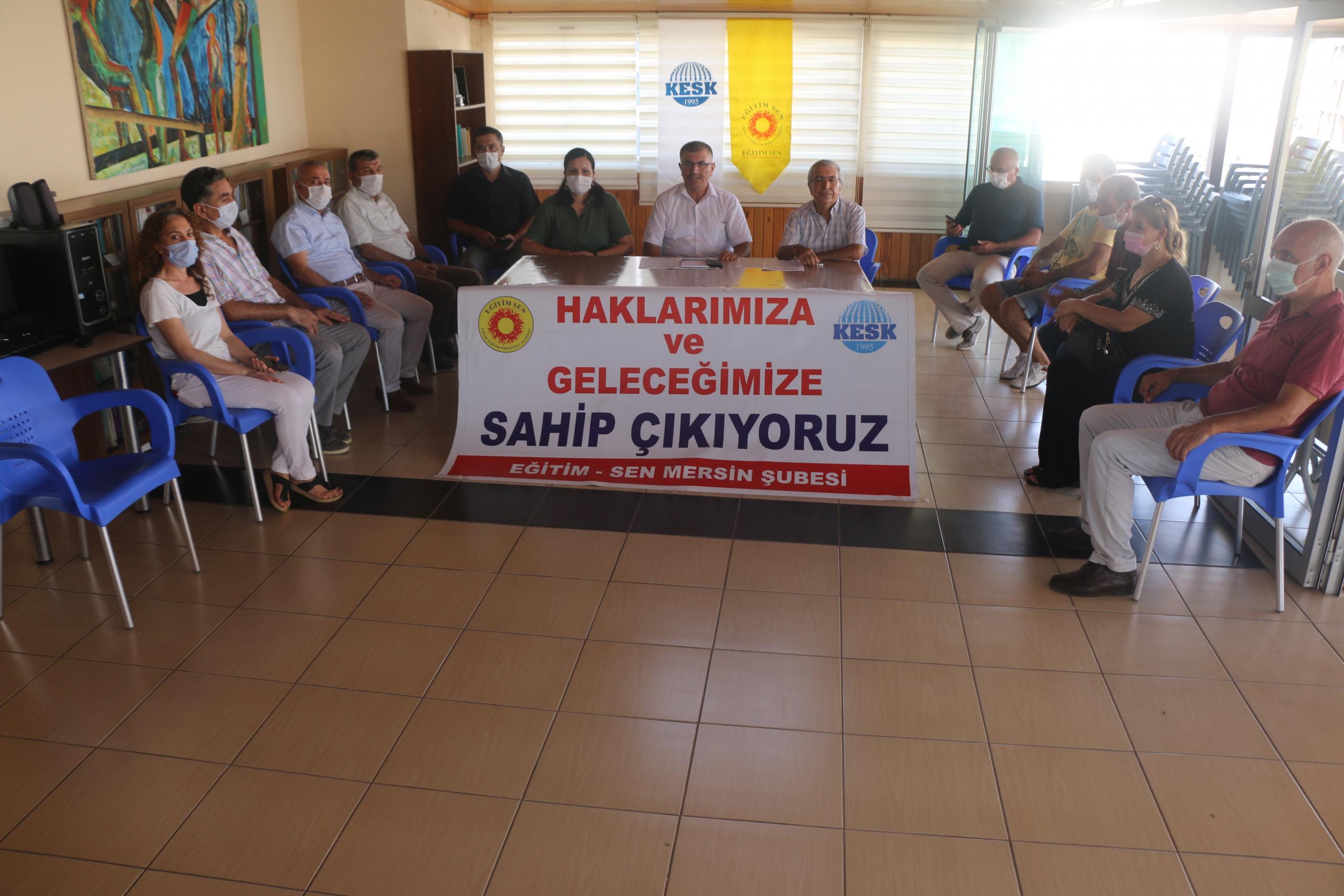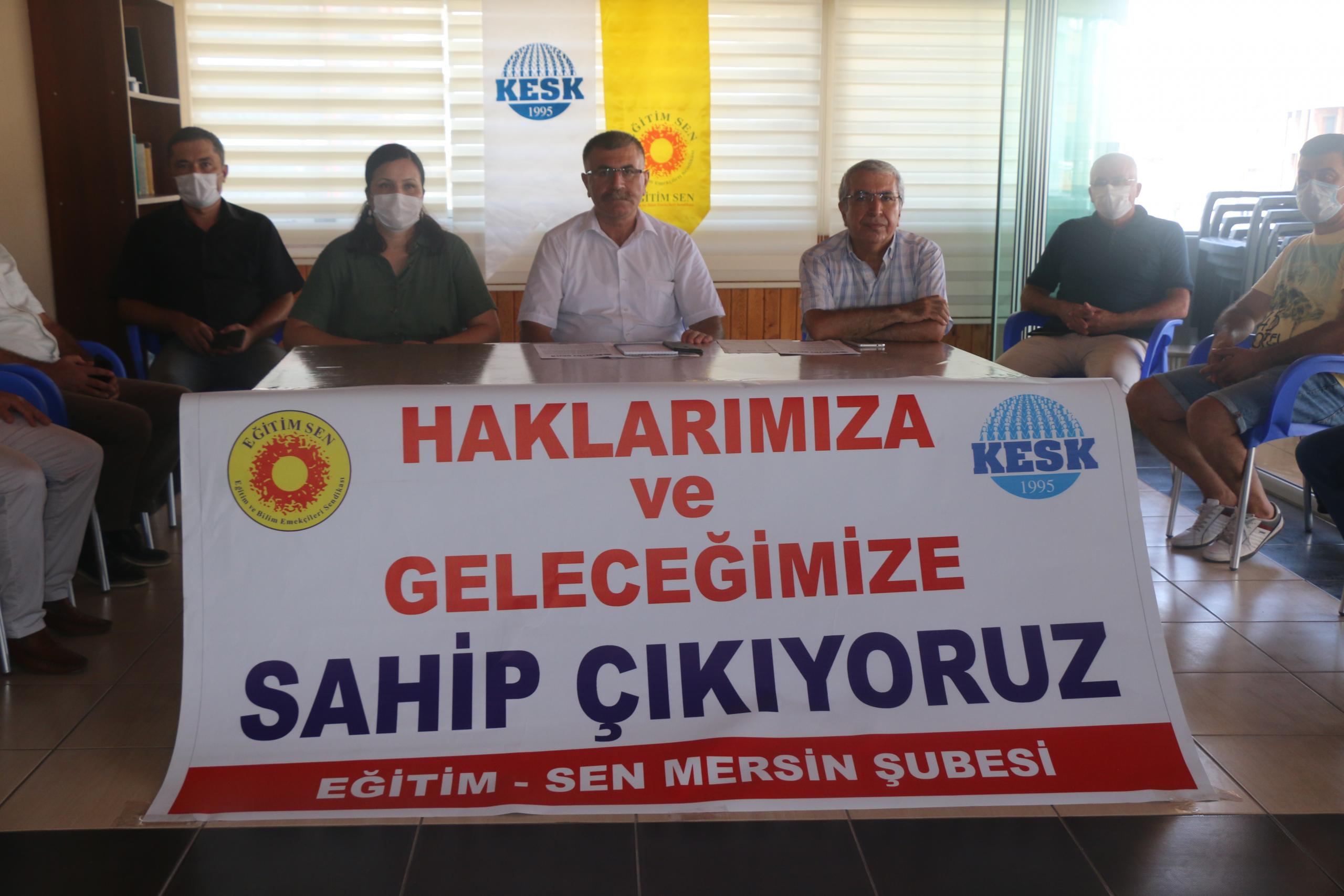 Mersin Eğitim-Sen de “Haklarımıza ve geleceğimize sahip çıkıyoruz!” başlığıyla basın açıklaması yaptı. Emek ve Demokrasi bileşeni kurumların da destek verdiği açıklamayı Eğitim-Sen Genel Mali Sekreteri Ahmet Karagöz okudu.