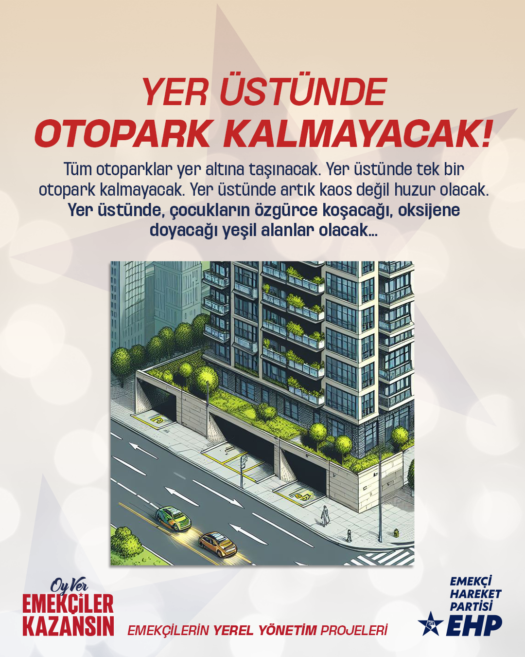 Tüm otoparklar yer altına taşınacak. Yer üstünde tek bir otopark kalmayacak. Yer üstünde artık kaos değil huzur olacak. Yer üstünde, çocukların özgürce koşacağı, oksijene doyacağı yeşil alanlar olacak.