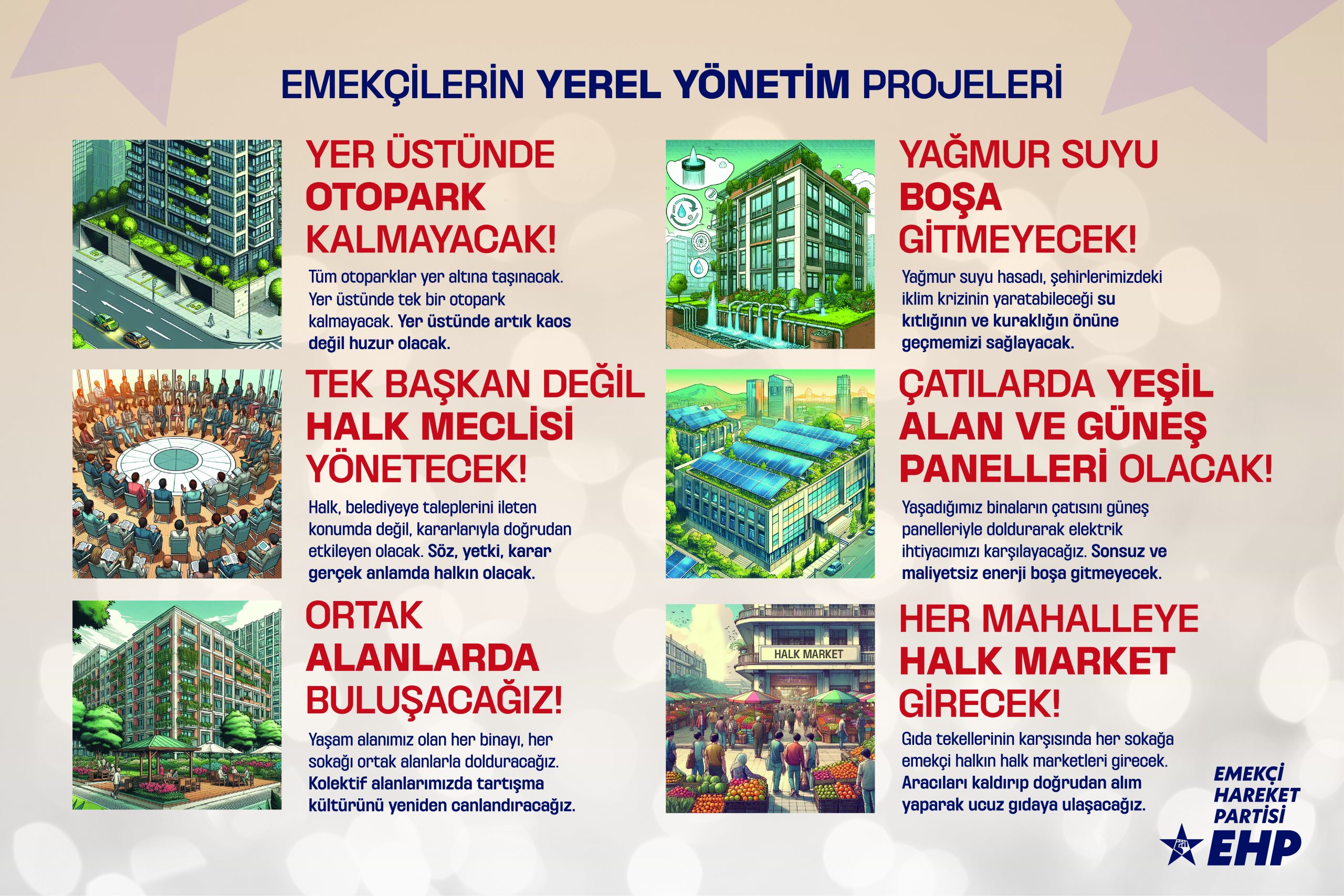 Emekçi Hareket Partisi, yerel yönetimlerde atacakları ilk adımları açıkladı. Belediyenin halk meclisleri ile yönetileceği söylenen açıklamada halkın gıda ihtiyacını karşılamak için her mahalleye Halk Market açılacağı belirtildi. Ayrıca otopark sorununun çözümü için yeraltı otoparklarına dönüşümün gerçekleştirileceği ve kazanılan alanların yeşil alana çevrileceği açıklandı.
