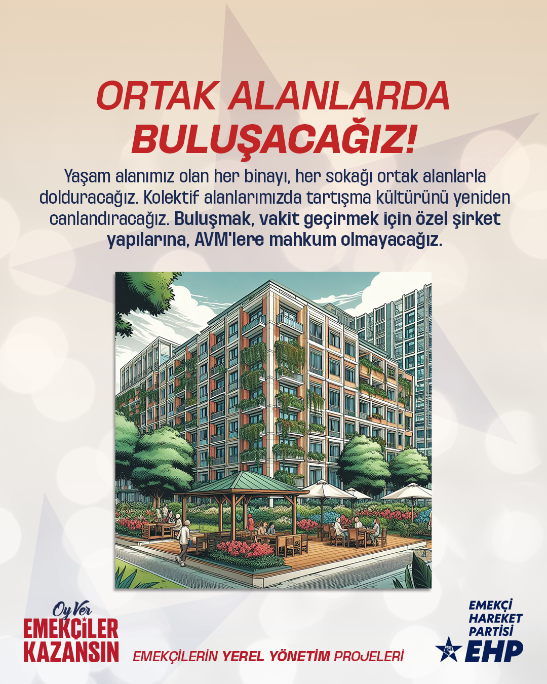 Yaşam alanımız olan her binayı, her sokağı ortak alanlarla dolduracağız. Kolektif alanlarımızda tartışma kültürünü yeniden canlandıracağız. Buluşmak, vakit geçirmek için özel şirket yapılarına, AVM’lere mahkum olmayacağız.
