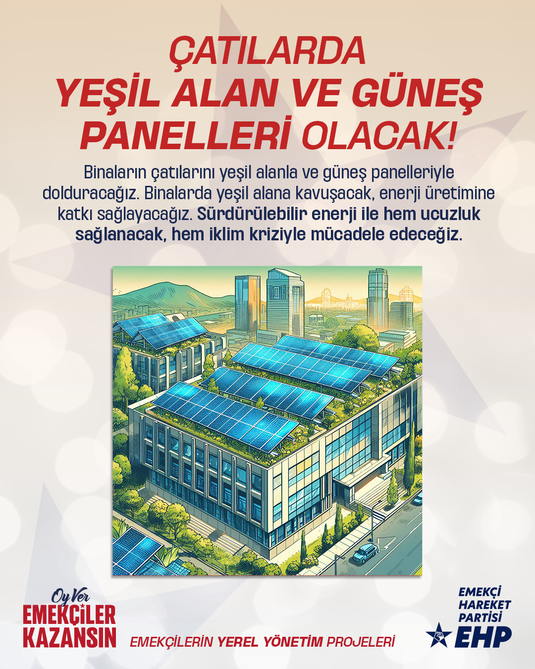 Binaların çatılarını yeşil alanla ve güneş panelleriyle dolduracağız. Binalarda yeşil alana kavuşacak, enerji üretimine katkı sağlayacağız. Sürdürülebilir enerji ile hem ucuzluk sağlanacak, hem iklim kriziyle mücadele edeceğiz.