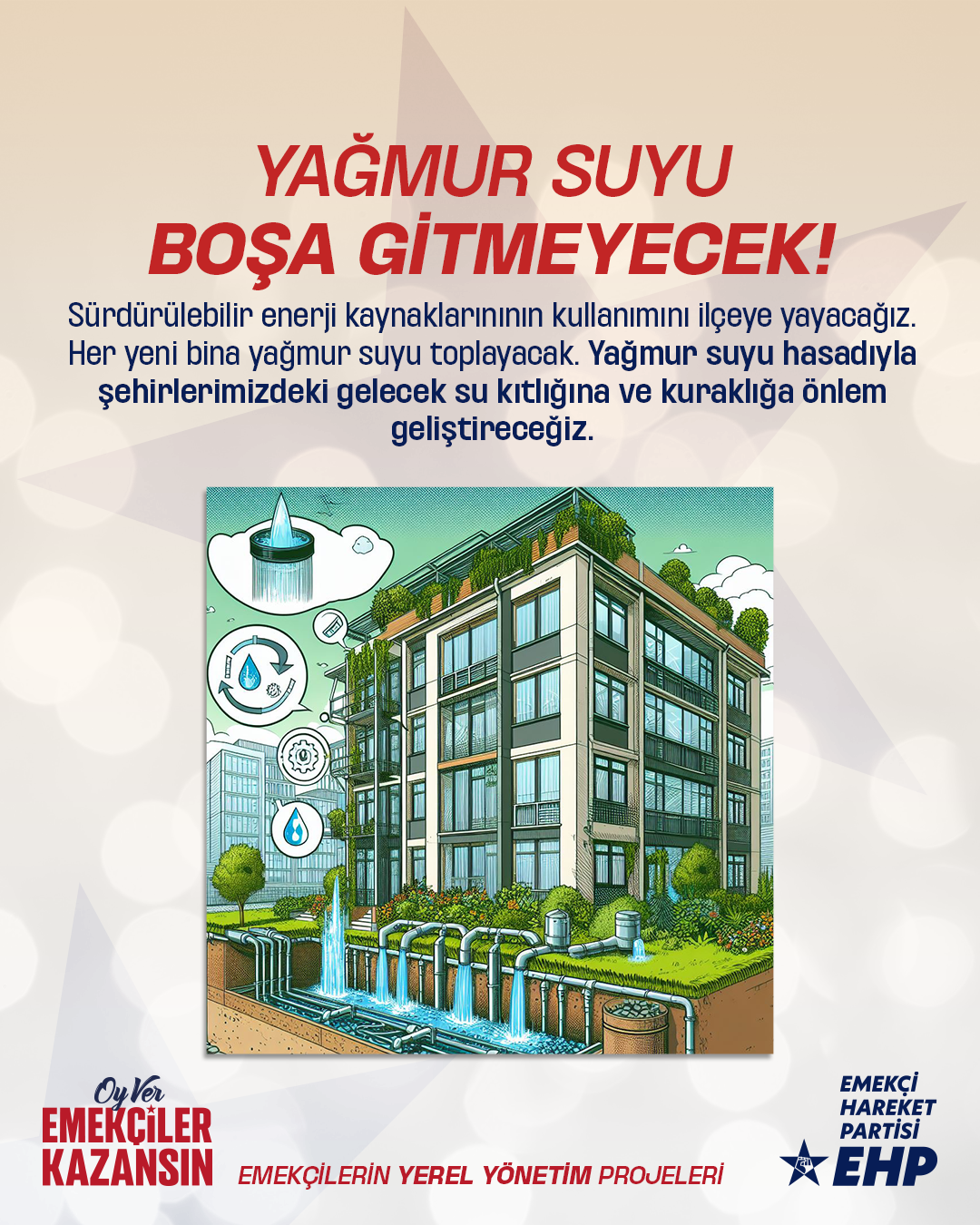 Sürdürülebilir enerji kaynaklarınının kullanımını ilçeye yayacağız. Her yeni bina yağmur suyu toplayacak. Yağmur suyu hasadıyla şehirlerimizdeki gelecek su kıtlığına ve kuraklığa önlem geliştireceğiz.