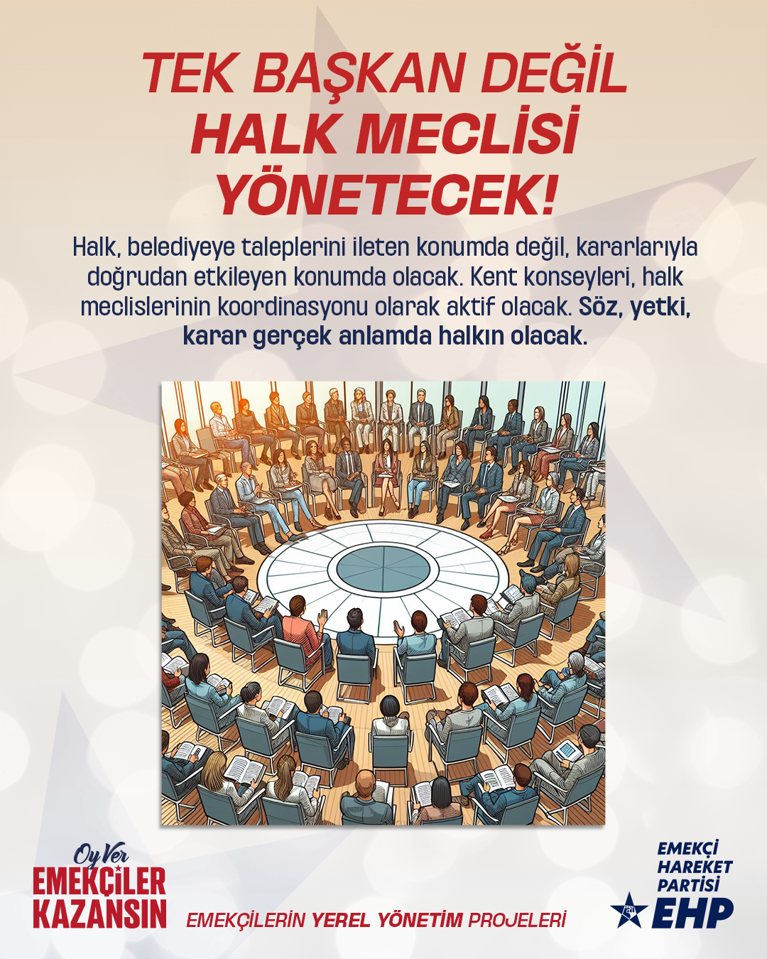 Halk, belediyeye taleplerini ileten konumda değil, kararlarıyla doğrudan etkileyen konumda olacak. Kent konseyleri, halk meclislerinin koordinasyonu olarak aktif olacak. Söz, yetki, karar gerçek anlamda halkın olacak.