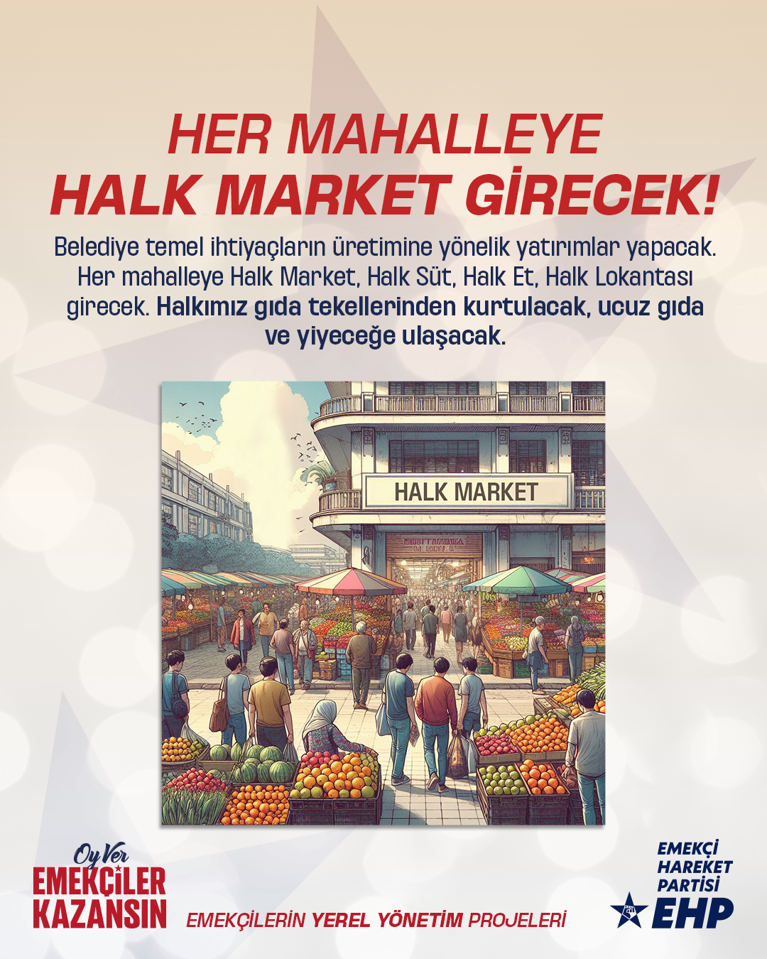 Belediye temel ihtiyaçların üretimine yönelik yatırımlar yapacak. Her mahalleye Halk Market, Halk Süt, Halk Et, Halk Lokantası girecek. Halkımız gıda tekellerinden kurtulacak, ucuz gıda ve yiyeceğe ulaşacak.