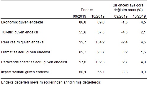 Ekim ayında tüketici güven endeksi 57 değerine, reel kesim güven endeksi 104,2 değerine, hizmet sektörü güven endeksi 90,7 değerine, perakende ticaret sektörü güven endeksi 102,3 değerine ve inşaat sektörü güven endeksi 65,1 değerine yükseldi.