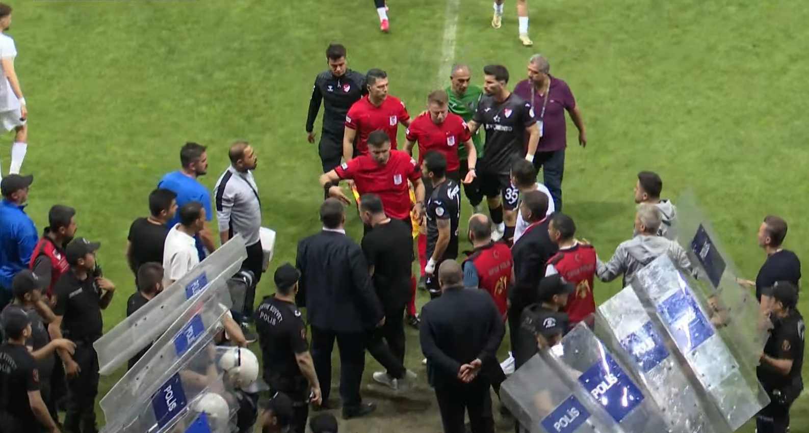 Tribünlerden yapılan saldırıların devam etmesi ardından yan hakem de başına aldığı bir cisim ile yaralandı. Bu gelişme ardından Hakem Ümit Öztürk, müsabakayı durdurdu.