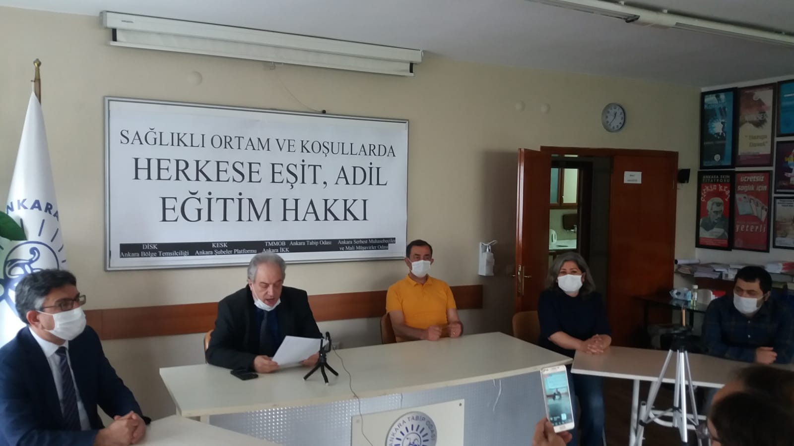 Milli Eğitim Bakanlığı, 20 Haziran’da yapacağını açıklamıştı. ÖSYM tarafından yapılacak 27-28 Haziran tarihlerinde gerçekleştirilecek olan LGS ve YKS sınavlarına ilişkin KESK Ankara Şubeler Platformu, DİSK Ankara Bölge Temsilciliği, TMMOB Ankara İl Koordinasyon Kurulu, Ankara Serbest Mali Müşavirler Odası Ankara ve Ankara Tabip Odası tarafından Ankara Tabip Odası’nda bir basın açıklaması yapıldı. Kurumlar adına ortak açıklamayı ATO Şube Başkanı Dr. Vedat Bulut okudu.