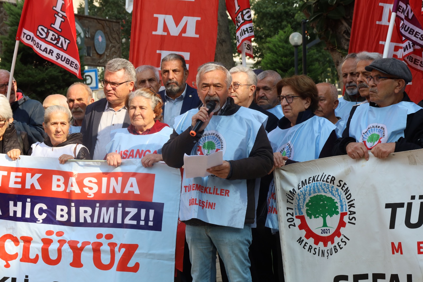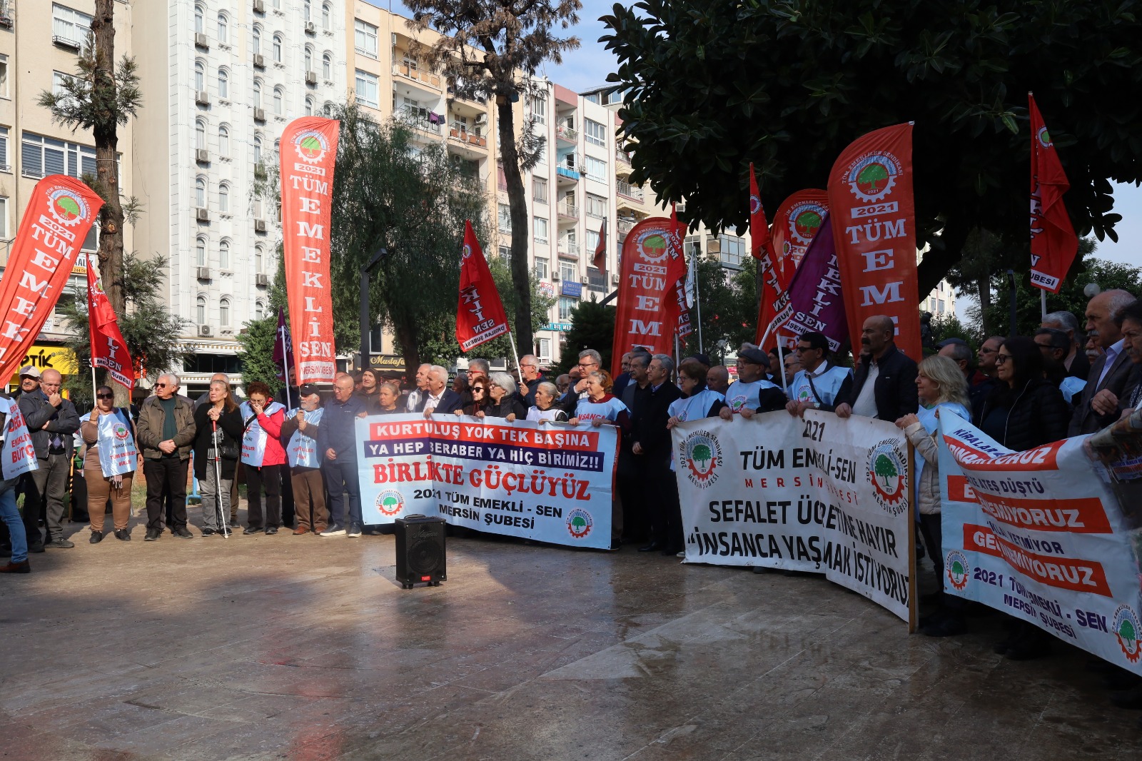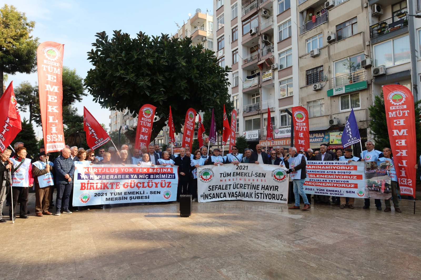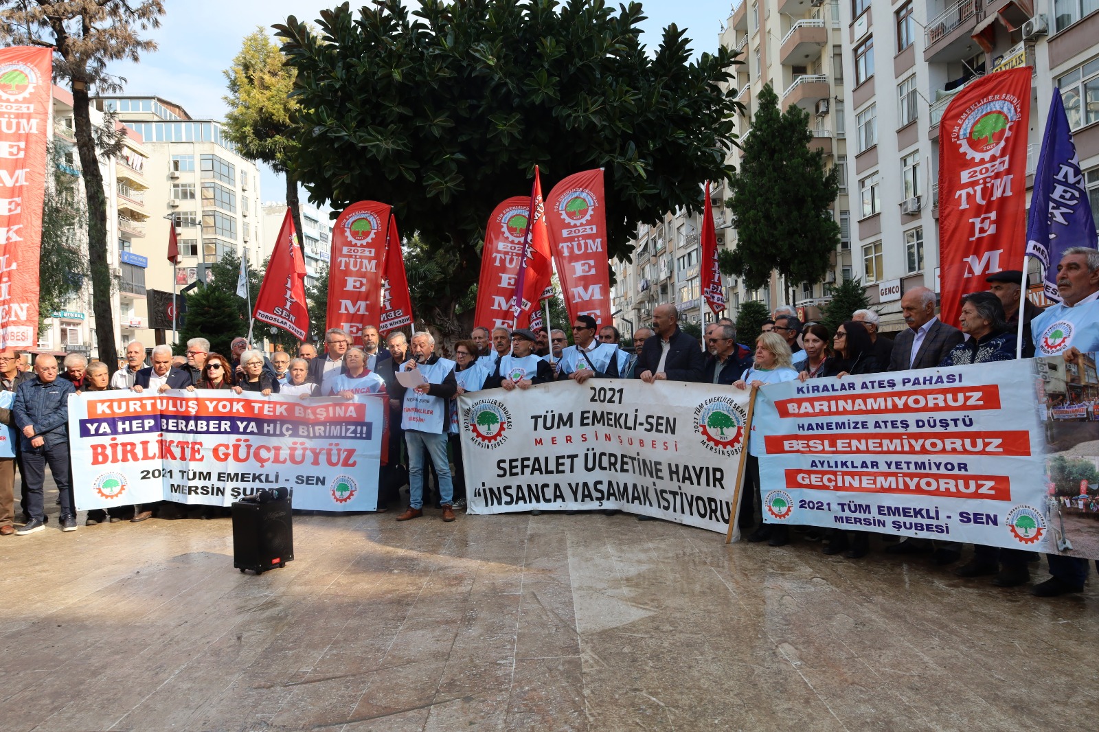 Türkiye Emekliler Sendikası ve 2021 Tüm Emekliler Sendikası (2021 Tüm Emekli Sen) Mersin Şubesi, 28 bin 75 lira olarak açıklanan asgari ücret zammını protesto etmek için Özgür Çocuk Parkı’nda basın açıklaması gerçekleştirdi. “Sendika hakkımız engellenemez. Emekli sendikaları yasası çıkarılsın”, “Yüzyılın ayıbı. Geçinemiyoruz, beslenemiyoruz, barınamıyoruz. İnsanca yaşamak istiyoruz” ve “Kurtuluş yok tek başına, ya hep beraber, ya hiçbirimiz” pankartlarının açıldığı açıklamada, “İnsanca yaşamak istiyoruz” ve “Direne direne kazanacağız” sloganları atıldı. Açıklamaya, Mersin Emek ve Demokrasi Platformu bileşenleri de katılım sağladı.