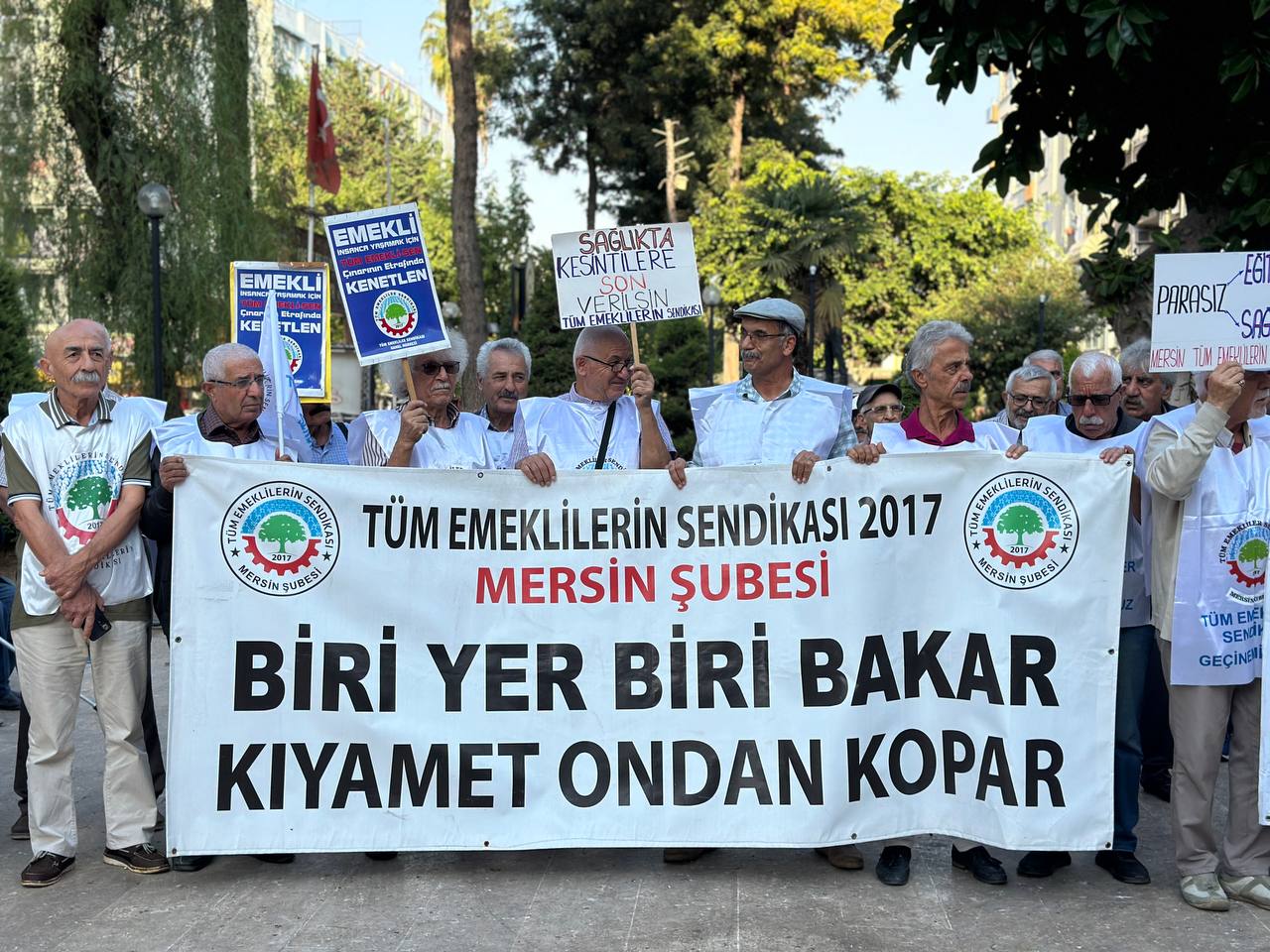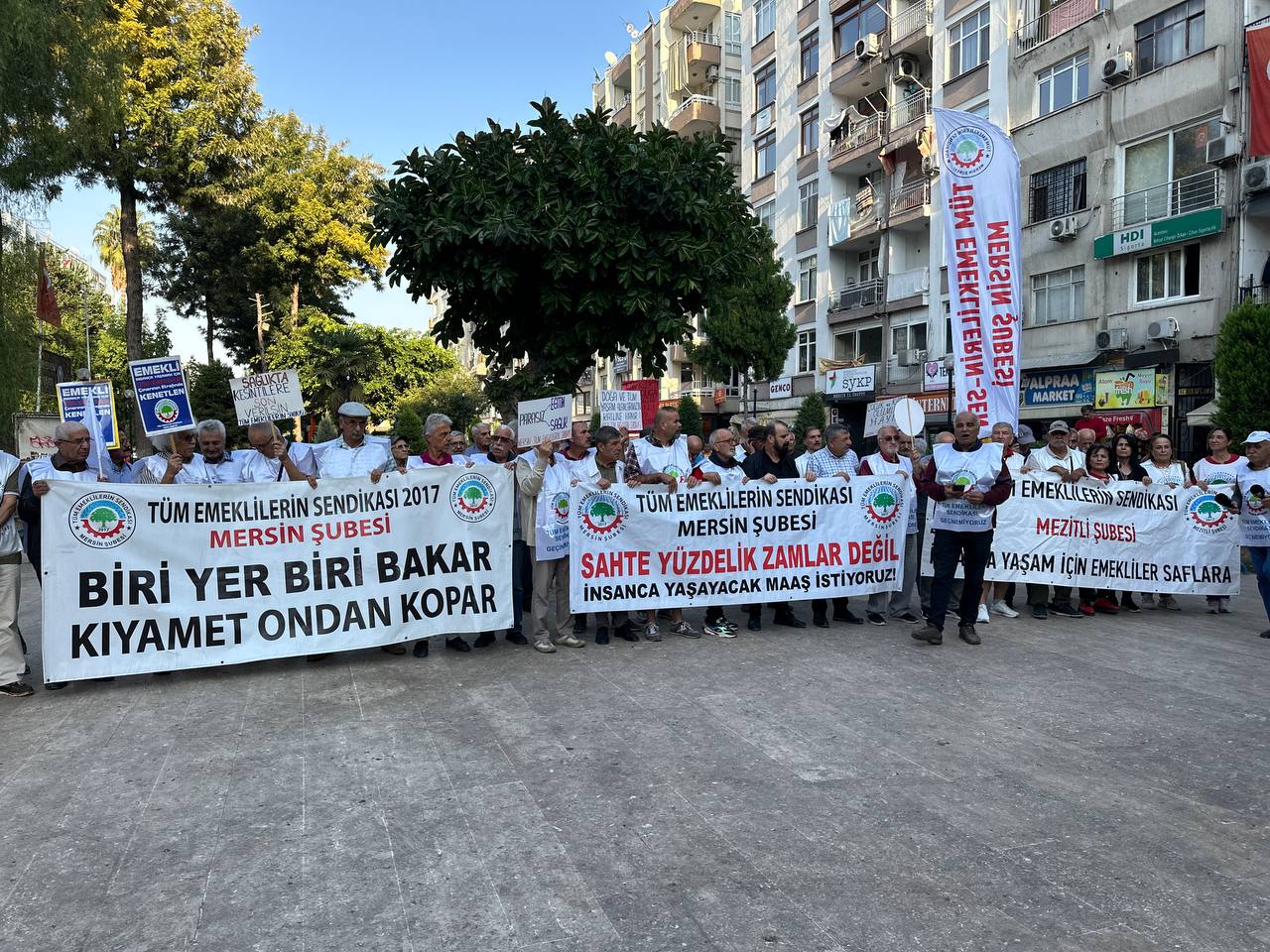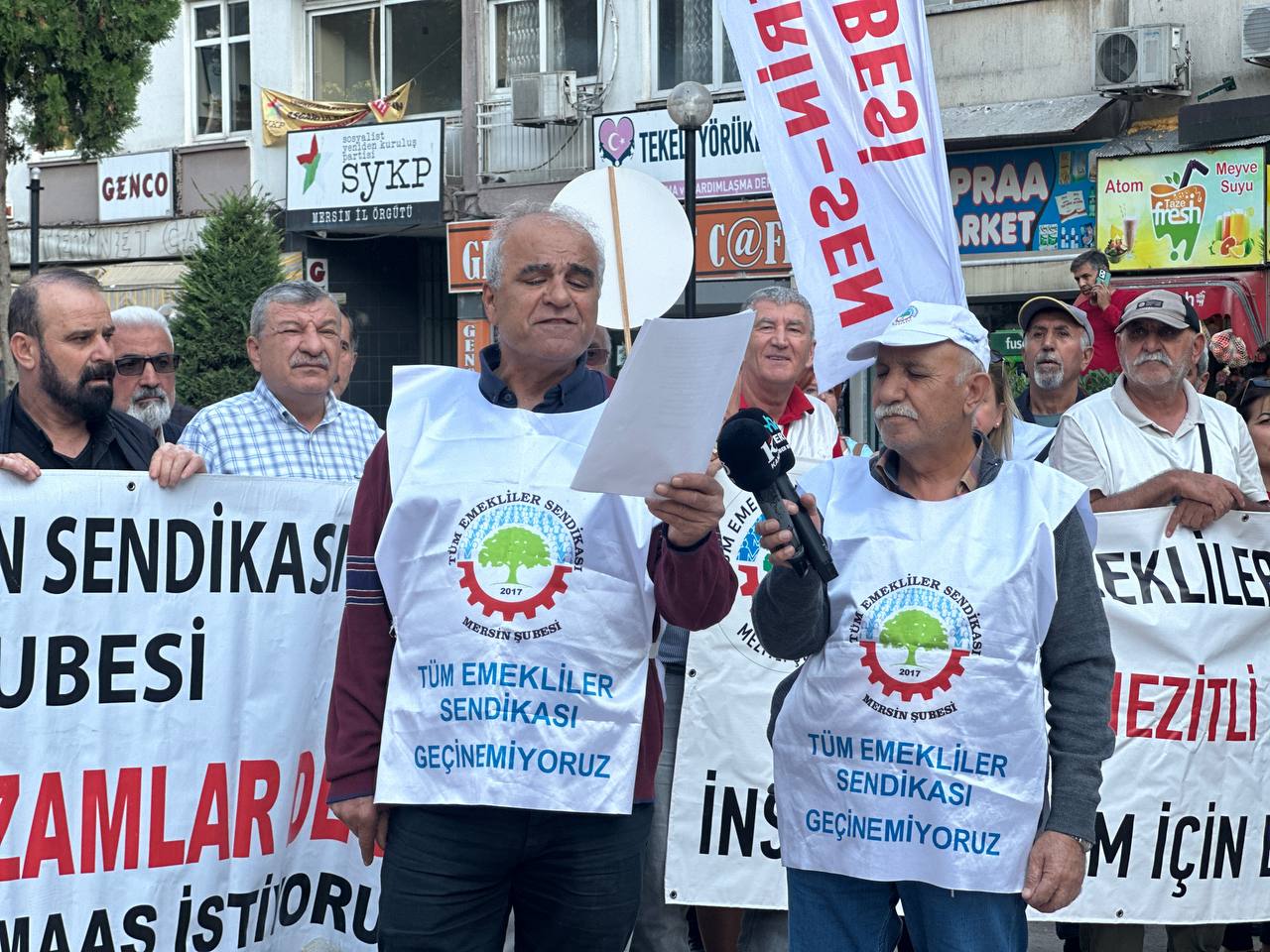 Tüm Emeklilerin Sendikası Mersin temsilciliği “Açlığa ve sefalete hayır demek için Ankara’ya yürüyoruz” konulu basın açıklaması yaptı. Açıklamayı sendika yürütme kurulu üyesi Oktay Canpolat okudu.
