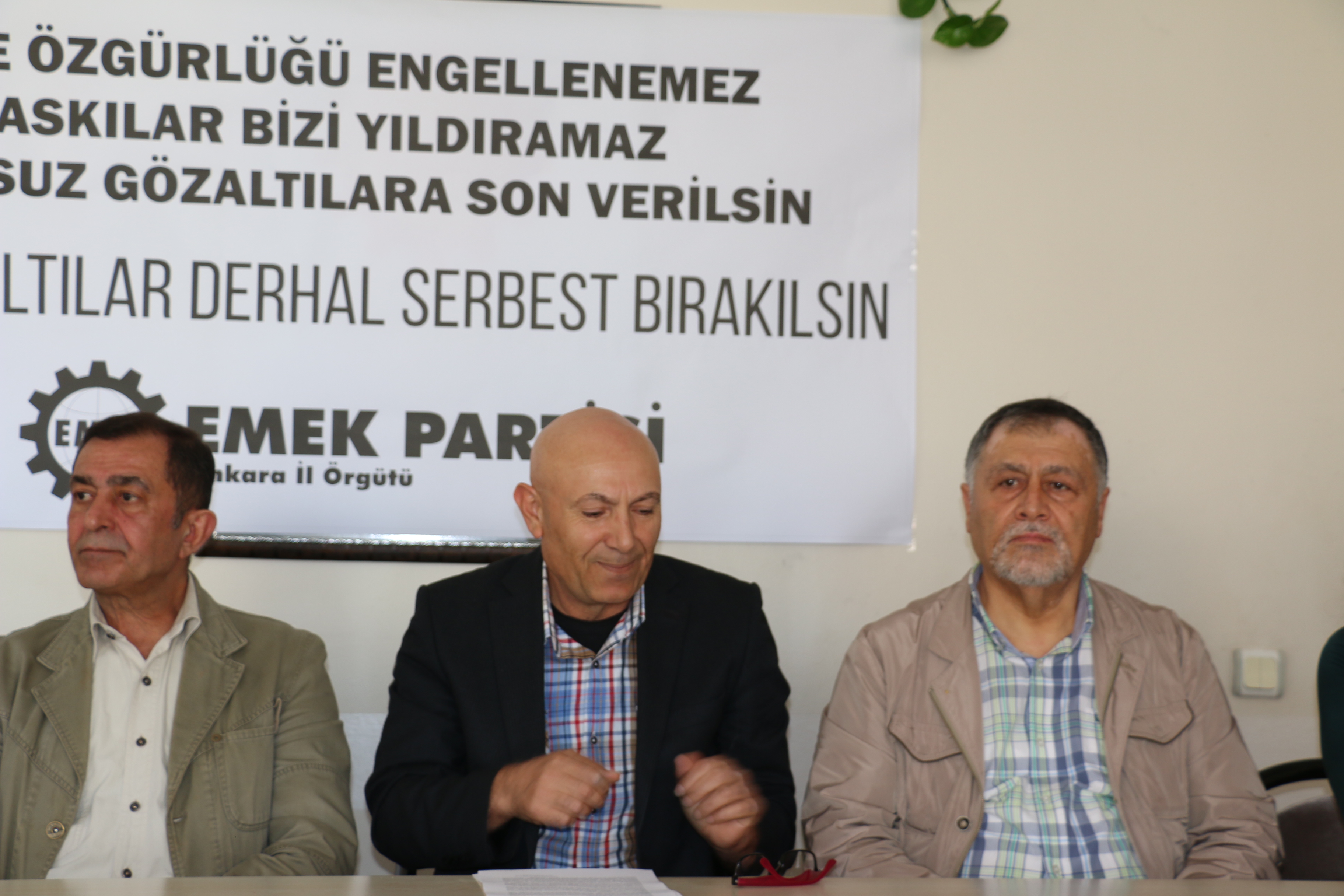 Emek Partisi, gözaltılara ilişkin basın açıklaması gerçekleştirdi. Açıklamaya HDP Ankara il yönetiminden Mehmet Temiz avcı, Halkevlerinden MYK üyesi Mustafa Eberli Köse, Kılıç Disk Dev Maden-Sen Ankara Bölge sorumlusu Tayfun Görgün BES Genel Başkanı Serpil Akpınar ve MYK üyesi Aziz Özkan, Tarım Orkam-Sen Genel Sekreteri Ali Kılıç katıldı.