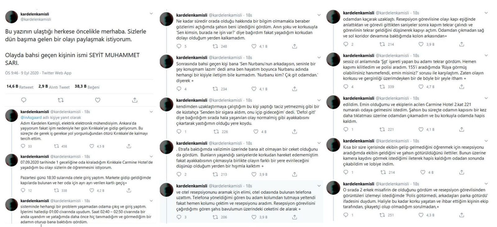 Konuya ilişkin açıklama yapan Elektrik Mühendisleri Odası Ankara Şubesi, “Elektrik Mühendisleri Odası (EMO) Ankara Şubesi Yönetim Kurulu Üyesi kadın arkadaşımız Kardelen Kamişli Kırıkkale’de 07.09.2020 tarihinde, konakladığı Carmine Hotel’de odasına habersiz giren Seyit Muhammed Sarı isimli erkeğin tacizine ve saldırısına uğramıştır” denildi.