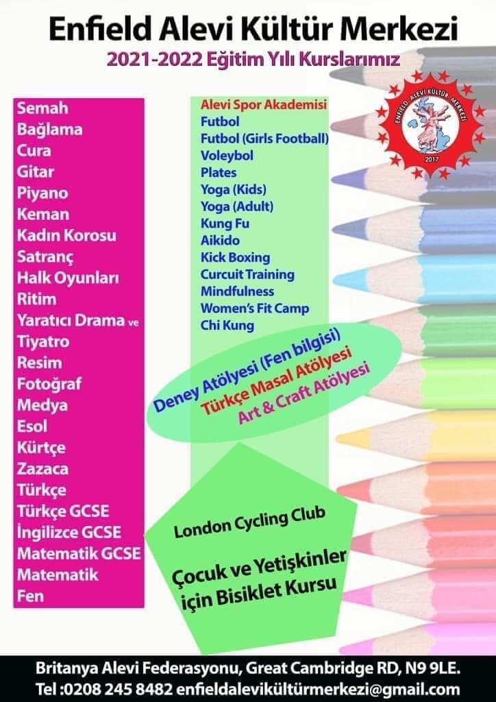 Enfield Alevi Kültür Merkezi ve Cemevi 2021-2022 eğitim yılında halk oyunlarından müziğe, semah eğitiminden dil kurslarına, bağlama kursundan santranca, tiyatrodan resim kursuna kadar birçok kişiye kurs verecek.