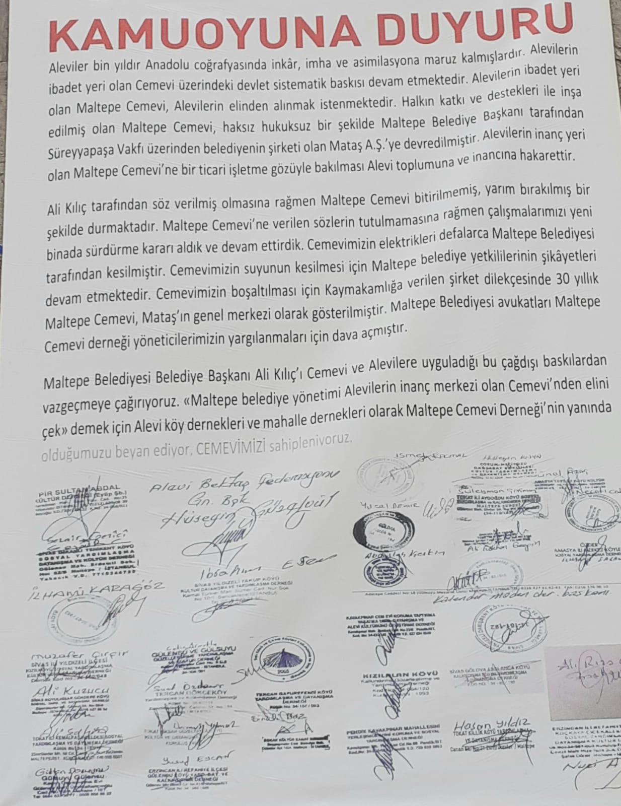 Maltepe Belediyesi’nin savcılığa suç duyurusunda bulunduğunu ifade eden Yılmaz, “MATAŞ’ın yerini Maltepe Cemevi işgal etti” iddiası nedeniyle geçen yine savcılığa ifade verdim. Bizim oy verdiğimiz Alevi kimlikli bir belediye başkanı içimizi acıtıyor. Belediye ekipleri geliyor kapımızı kırıyor ve afişlerimizi götürüyor. Bu inanç merkezimize bir saldırıdır, şiddetle kınıyorum. Belediyelerin artık cemevlerinden ellerini çekmesini istiyoruz. Çünkü hiçbir belediyenin cemevini yönetmeye hakkı yok. Alevi bir başkan, Alevi toplumuna zulüm yapıyor bunu şiddetle kınıyoruz” diye konuştu.