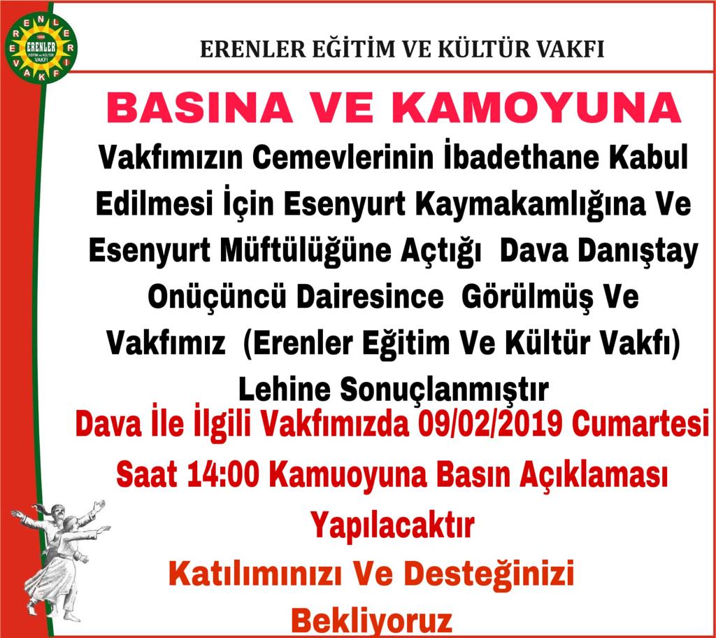 Erenler Eğitim ve Kültür Vakfı’nın elektrik davasıyla ilgili Danıştay cemevinden yana karar almıştı. Esenyurt Kaymakamlığı ve Müftülüğü düzeltme istemiyle karara itiraz etmişti. Danıştay, bu düzeltme isteğini reddederek cemevi lehine karar verdi.