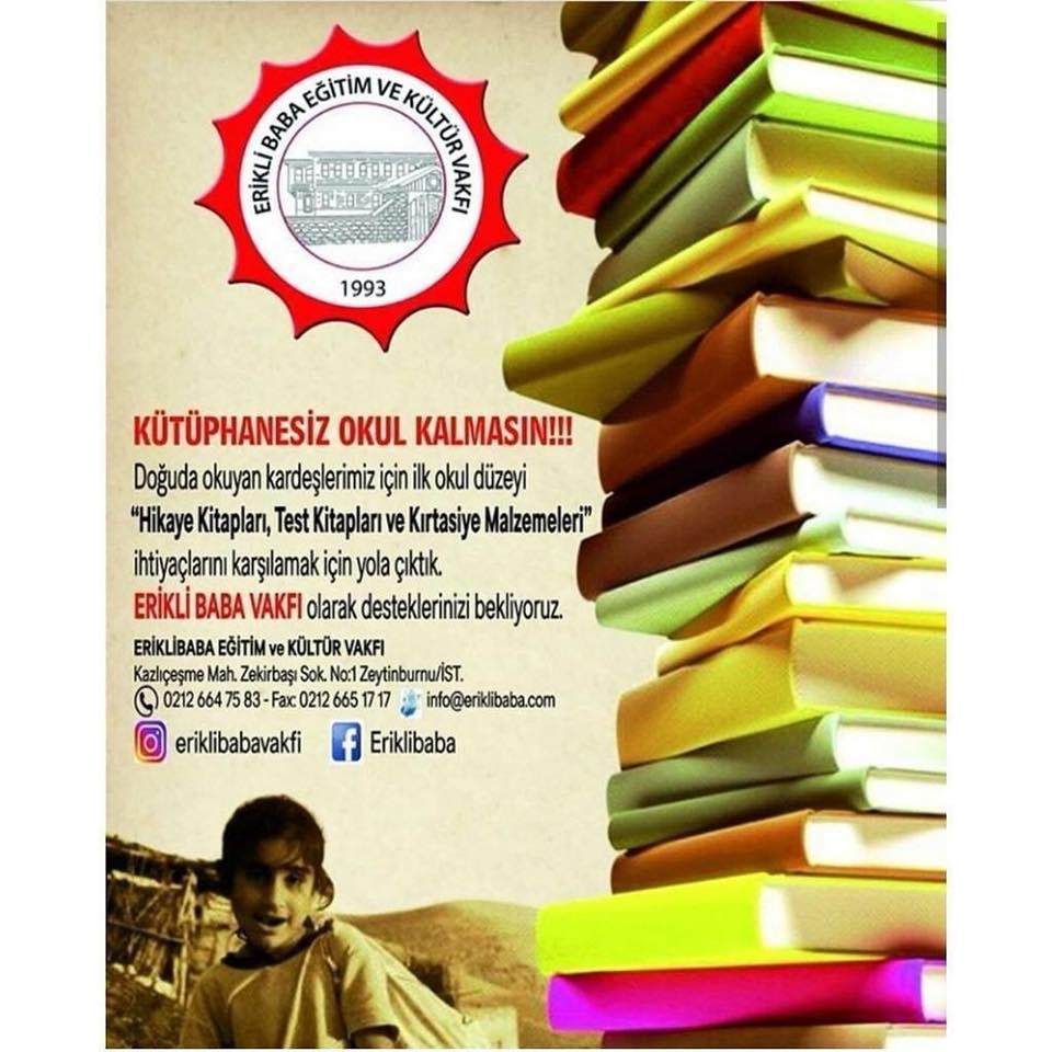 İstanbul Zeytinburnu’nda bulunan Erikli Baba Eğitim ve Kültür Vakfı, ‘Kütüphanesiz okul kalmasın’ kampanyası başlatmış ve bu kampanyayla bölge illerinde okuyan çocukların, ‘Hikaye kitapları, test kitapları ve kırtasiye malzemeleri’ gibi birçok ihtiyacını gidermek amaçlandığı belirtilmişti.