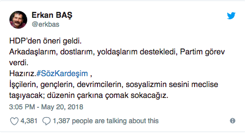 “HDP’den öneri geldi. Arkadaşlarım, dostlarım, yoldaşlarım destekledi, Partim görev verdi. Hazırız. #SözKardeşim , İşçilerin, gençlerin, devrimcilerin, sosyalizmin sesini meclise taşıyacak; düzenin çarkına çomak sokacağız.”