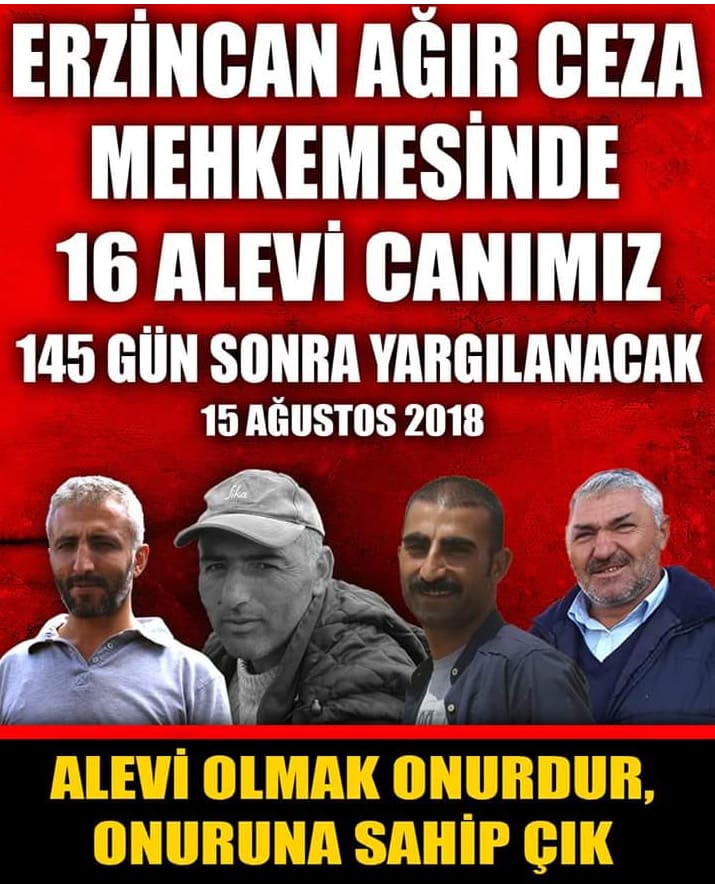 “24 Mart günü komplo teorileri ile göz altına alınan dernek yöneticilerimiz başta olmak üzere 16 canımız tutuklanmıştır. Bu güne kadar mahkemeye çıkarılmayan canlarımızın ilk mahkemesi 15 Ağustosta Erzincan adliyesinde görülecektir. Tüm canlarımızın Erzincanda Alevi çalışmalarının engellenmesi amacı ile yapılan bu baskıların karşısında durmalarını ve bizlere destek olmalarını istiyoruz. Gün tutuklu canlarımızla dayanışma günüdür.”