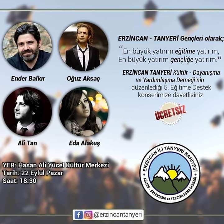 Erzincan Tanyeri Kültür, Dayanışma ve Yardımlaşma Derneği, 22 Eylül Pazar günü eğitime destek konseri düzenleyecek. Bu yıl 5’incisi düzenlenecek olan eğitime destek konseri “En büyük yatırım eğitime yatırım, en büyük yatırım gençliğe yatırım” şiarıyla yapılacak.
