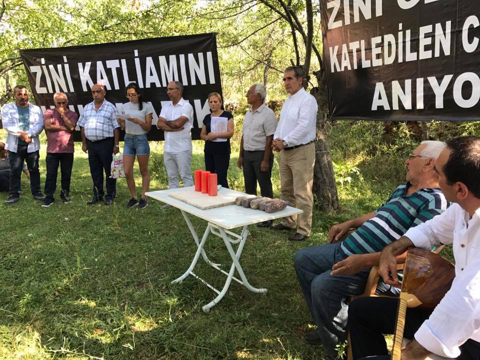 Fransa Alevi Birlikleri Federasyonu Başkanı Erdal Kılıçkaya toplantıda yaptığı konuşmada, kurşuna dizilen ve sayıları kesin olmamakla birlikte 100’e yakın masum yurttaşın ne olduğunu bilmedikleri bir suçun cezasını yaşamlarıyla ödediklerini anlattı. Ölenlerden birinin eşinin, çocuklarına “Ben ölürsem, mezarıma taş koymayın, ismimi yazmayın. Benim kocam Zini Gediği’nde yatıyor, isimsiz, taşsız. İsim neyime, taş neyime?” vasiyetinde bulunduğunu anlatan Kılıçkaya, 79 yıl önce açılan bu yaranın katledilenlerin mezarsız kalması ve devletin yaşananlardan dolayı özür dilememesi nedeniyle kanamayı sürdürdüğünü ifade etti.