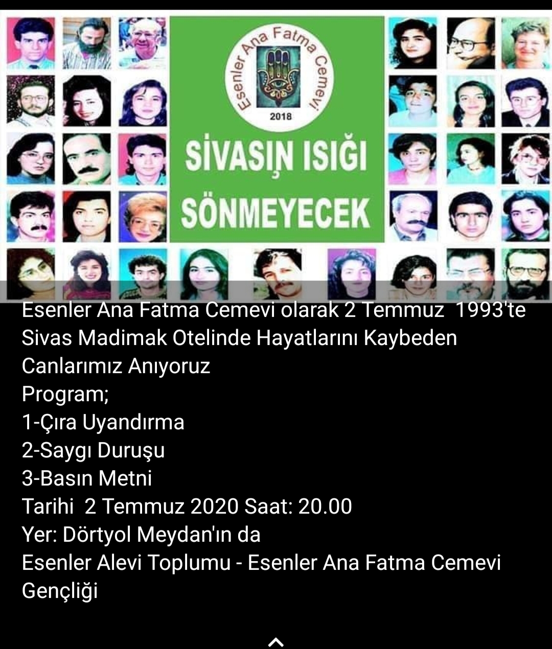Esenler Ana Fatma Cemevi ve Esenler Alevi Tplumu, 2 Temmuz 1993’te Sivas Madımak Oteli’nde hayatını kaybedenleri anmak için anma programını açıkladı.