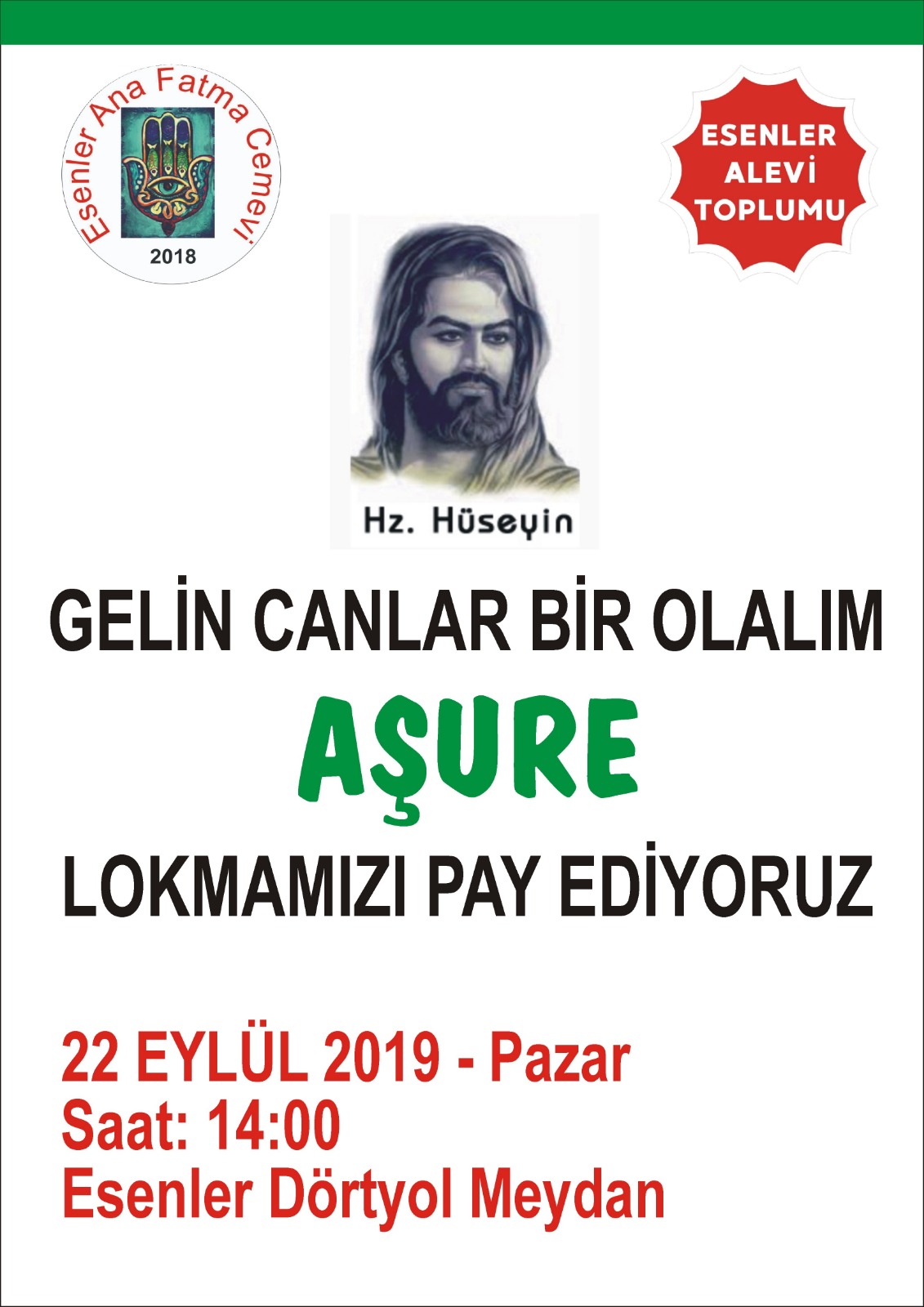 PİRHA- Esenler Ana Fatma Cemevi yarın Esenler Dörtyol Meydanı’nda aşure lokması pay edecek.