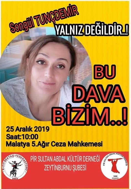 Duruşmada mütalaa veren savcı örgüt üyeliğinden Tunçdemir’e ceza istedi. Alevi kurumları Songül Tunçdemir’in 25 Aralık 2019 Çarşamba günü saat 10.00’da Malatya 5. Ağır Ceza Mahkemesi’nde görülecek karar duruşmasına “Bu dava bizim, Songül Tunçdemir yalnız değildir” diyerek çağrıda bulundu.