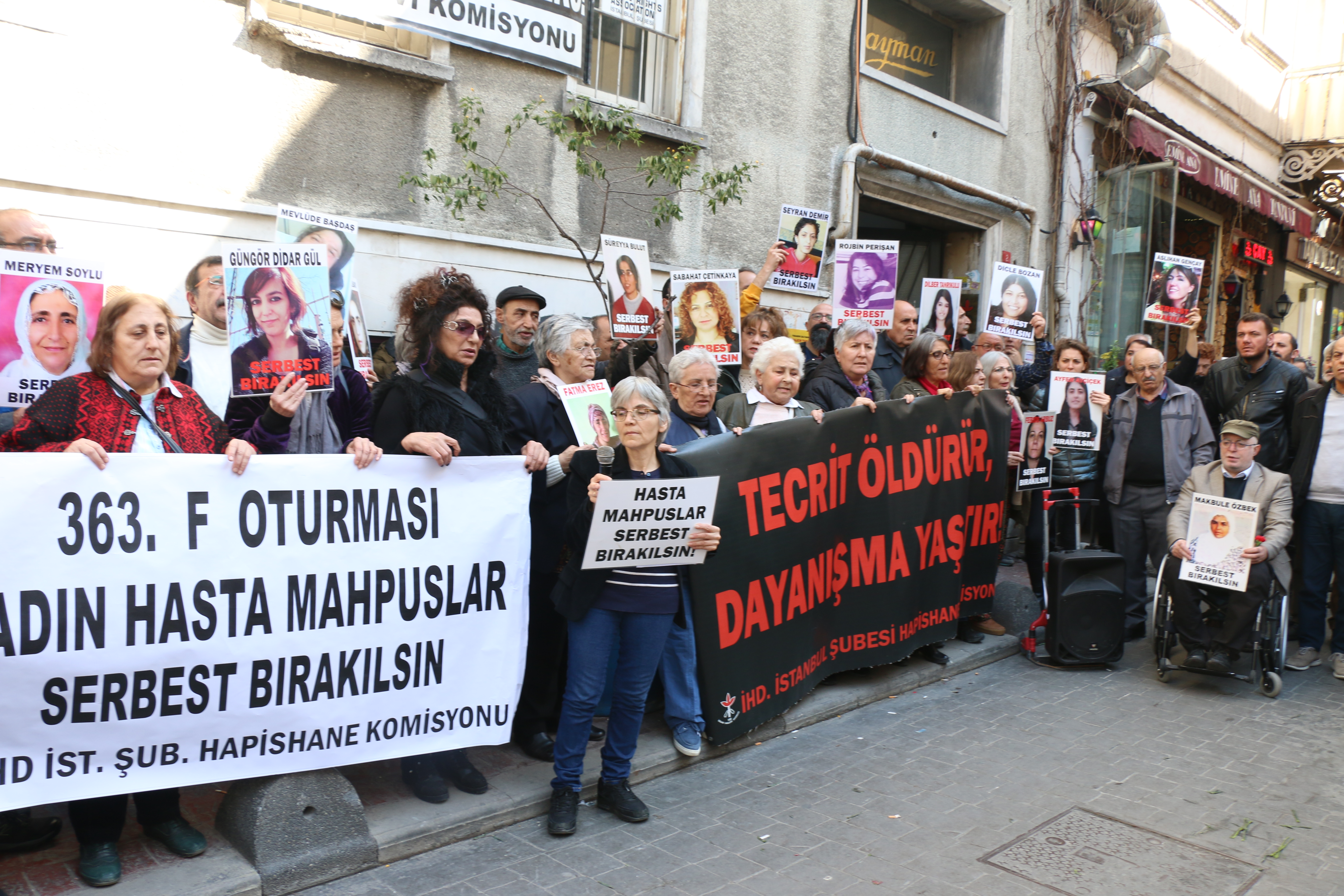 İnsan Hakları Derneği (İHD) İstanbul Şubesi önünde gerçekleşen 363. hafta F Oturması’nda “Kadın hasta mahpuslar serbest bırakılsın” ve “Tedavi haktır engellenemez” pankartları açıldı. 363. haftanın basın metnini İHD İstanbul Şubesi Hapishane Komisyonu’ndan Hatice Onaran okudu.