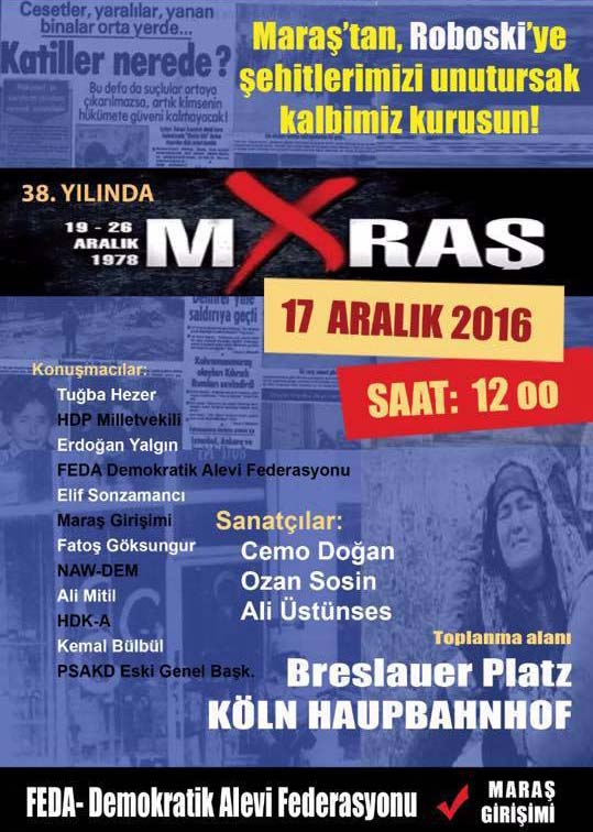 Daha öncesi ve gelecek katliamlar, soykırımlar tehlikesi hep bizler içindir. Bu Emevi zihniyetinin dönemsel olarak, biz mazlumları yoketmek için ortaya koyduğu türlü oyunlar karşısında uyanık olmalıyız. Özellikle Avrupada gerçekleştirilen Maraş anmalarına geniş bir katılım göstermeliyiz. Bu konuda duyarlı olmalıyız! Vicdanlı bir toplumun üyeleri olarak, atalarımızın bizlere miras bıraktığı Alevi inancımızın geregini yerine getirmeli ve sorumluluk içinde olmamaız gerektigini asla gözardı etmemeliyiz. Dolayısıyla bütün Alevileri, kürtleri, devrimci-demokrat bireyleri, dahası vicdanlı bütün dostlarımızı 17 Aralık Cumartesi günü Köln’de gerçekleştirilecek olan “Maraş’tan Roboski’ye, şehitlerimizi unutursak, kalbimiz kurusun!” mitingine katılmaya çağırıyoruz. Gün birlik, dirlik ve büyüklük.