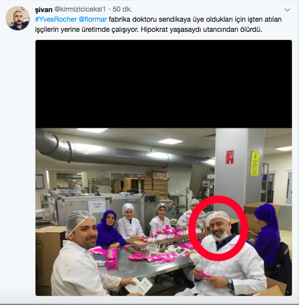 Bu işçilerden biri olan Petrol-İş Sendika yöneticisi Şivan Kırmızıçiçek’in, “Flormar fabrika doktoru sendikaya üye oldukları için işten atılan işçilerin yerine üretimde çalışıyor. Hipokrat yaşasaydı utancından ölürdü.” mesajını paylaştı.