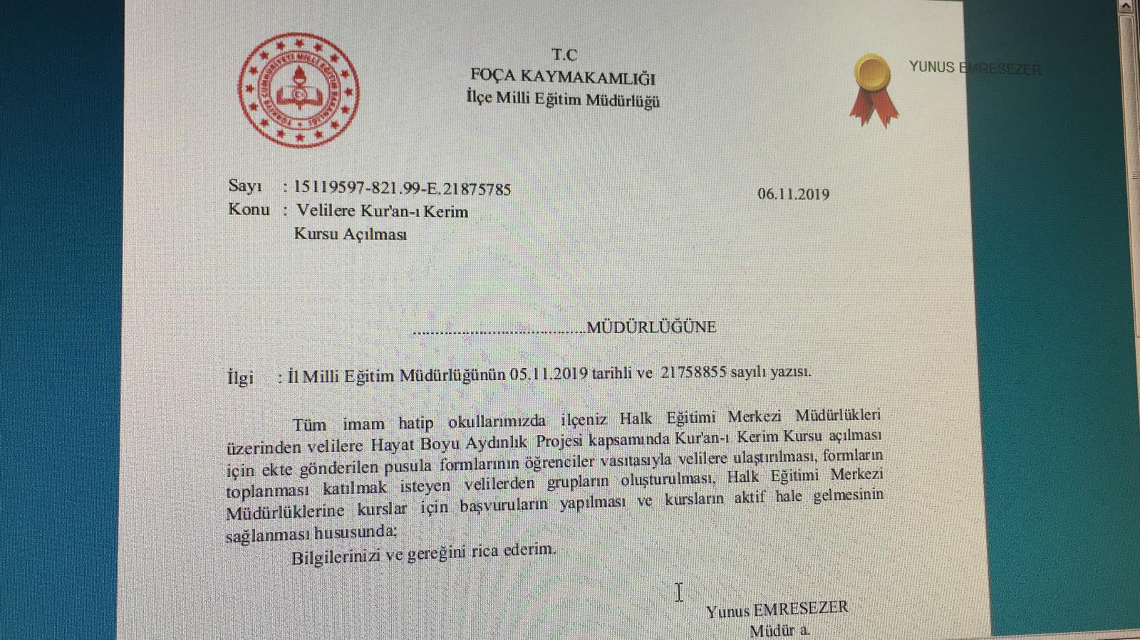İzmir Foça Kaymakamlığı İlçe Milli Eğitim Müdürlüğü, velilere Kuran-ı Kerim Kursu açılması için form gönderdi. 05.11.2019 tarihli ve 21758855 sayılı yazıda tüm imam hatip okullarında ilçede bulunan Halk Eğitim Merkezi Müdürlükleri üzerinden velilere Hayat Boyu Aydınlık Projesi kapsamında Kuran-ı Kerim Kursu açılması için gönderilen pusula formlarının öğrenciler vasıtasıyla velilere ulaştırılması gerektiği belirtildi.