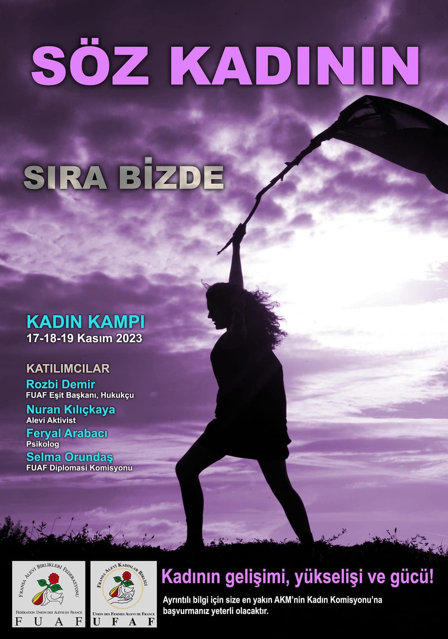“Taleplerimiz, söyleyeceklerimiz, haykıracaklarımız için birlikte buluşmaya davetlisiniz! Fransa Alevi Kadınlar Birliği’nin (FAKB) düzenli olarak her yıl gerçekleştirdiği kadın eğitim kampını, bu sene de sizlere sunmanın gururunu yaşıyor. Fransa’nın her bir köşesinden gelen kadın canlarımızla beraber üç gün boyunca sürecek eğitim kampımız 17- 18- 19 Kasım 2023 tarihlerinde gerçekleşecektir. Bu mozaiğe katılımıyla renk katmaya tüm kadın yoldaşlar davetlidir. 4. “Söz Kadının, Sıra Bizde” eğitim kampımıza bu YOL’da ben de varım diyen tüm kadınlarımızı bekliyoruz.”