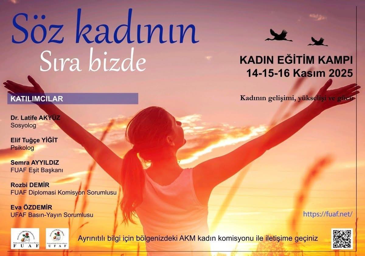 “Fransa Alevi Kadınlar Birliği, kadınların dayanışma ve eşitlik mücadelesine ışık tutan geleneksel Kadın Eğitim Kampı ile yeniden buluşuyor! 14-15-16 Kasım 2025 tarihleri arasında, Fransa’nın kalbinde yer alan Dijon şehrinde düzenlenecek kampımız, bu yıl “Söz Kadının, Sıra Bizde!” sloganıyla gerçekleştirilecek.