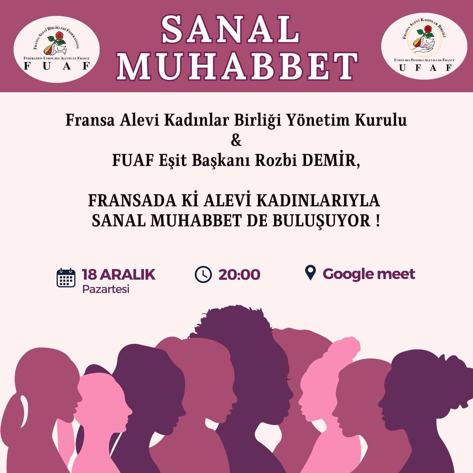 Fransa Alevi Kadınlar Birliği, kadınlarla sanal medya aracılığıyla buluşarak muhabbet gerçekleştirecek. Muhabbette Alevi kadınların örgütler içerisinde karşılaştığı zorluklar ve sorunlar üzerine tartışma yürütülecek.