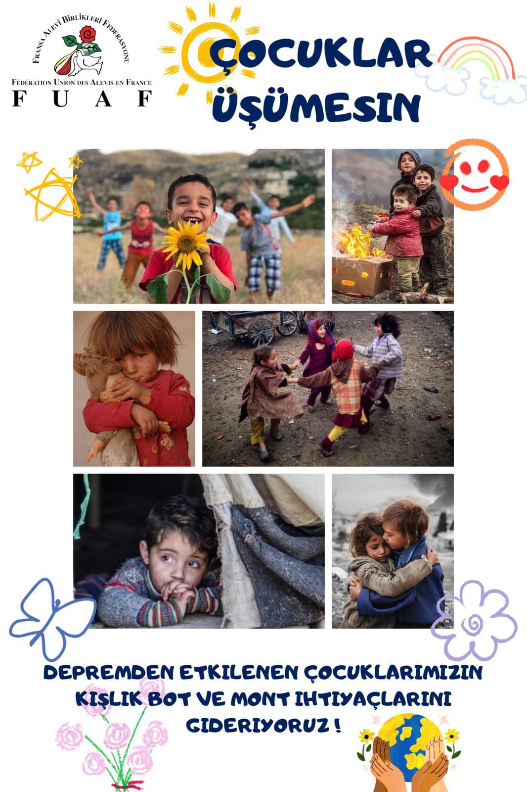 Fransa Alevi Birlikleri Federasyonu (FUAF), Maraş depreminde etkilenen çocukların kışlık ihtiyaçlarına dayanışma kampanyası başlattı. Çocuklar için hazırlan kışlık bot ve montlar bölgeye ulaştırılacak.
