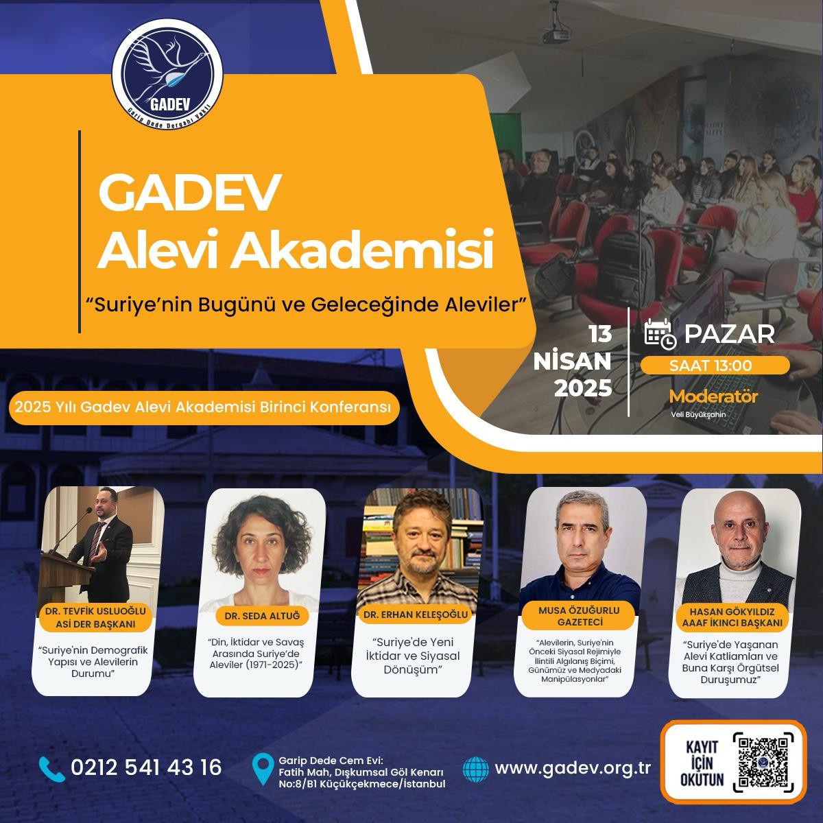 2025 Yılı GADEV Alevi Akademisi birinci konferansı’nın detayları kamuoyu ile paylaşıldı. “Suriye’nin Bugünü ve Geleceğinde Aleviler” başlığıyla 13 Nisan Pazar günü saat 13.00’te başlayacak konferansa, tüm yurttaşlar davet edildi.