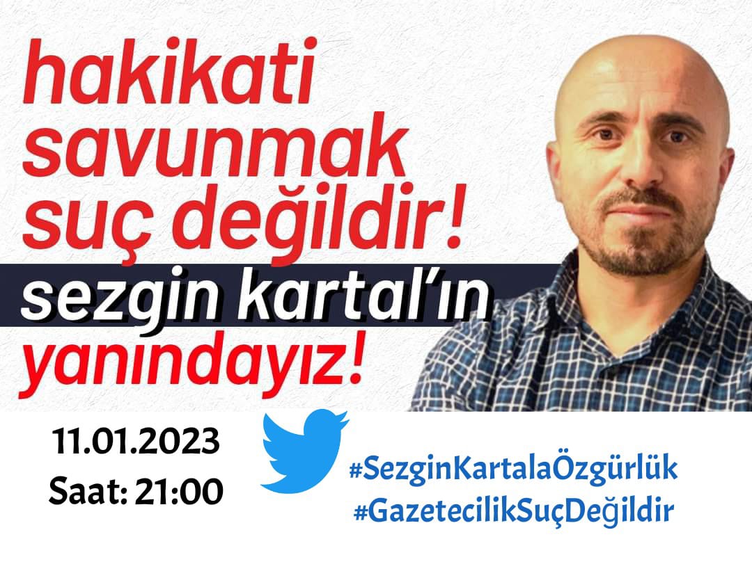 Sezgin Kartal’ın serbest bırakılması için saat 21.00’de “Hakikati savunmak suç değildir, Sezgin Kartal’ın yanındayız” denilerek, Twitter’da hashtag çalışması yapılacak.