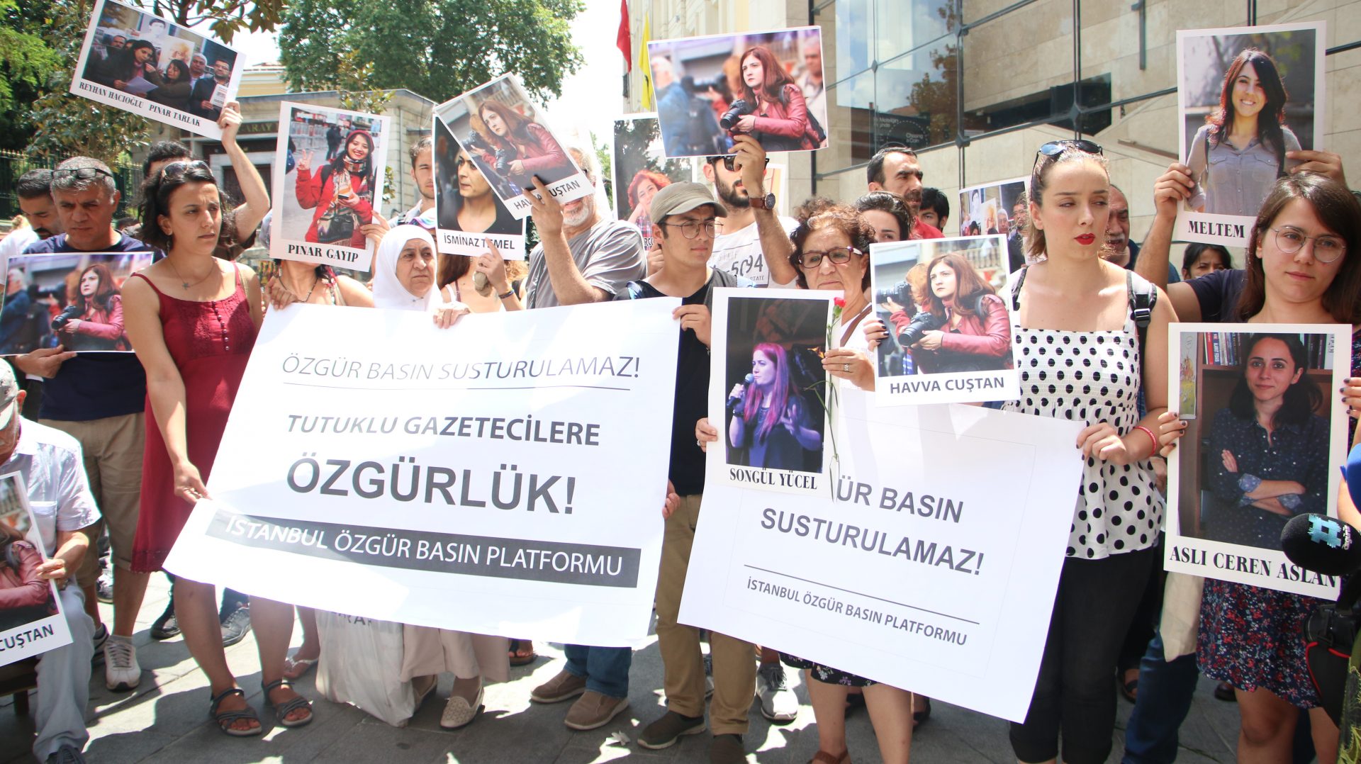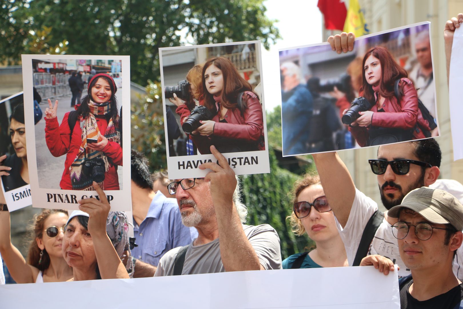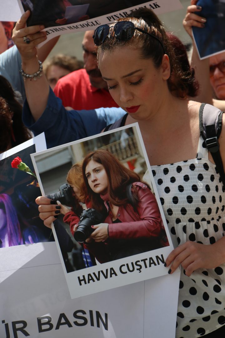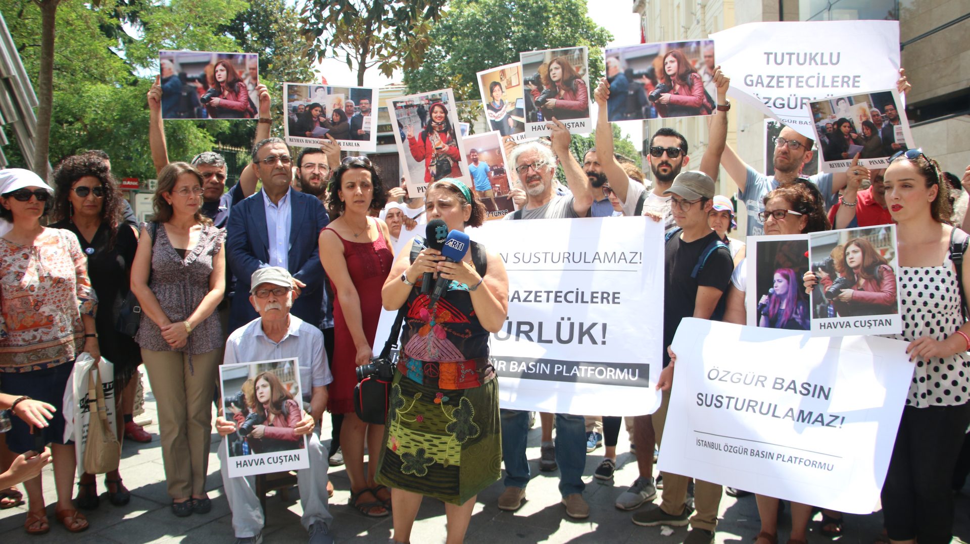 Özgür Basın Platformu üyeleri İstanbul Galatasaray Meydanı’nda basın açıklaması gerçekleştirdi. Eylemde Etkin Haber Ajansı editörü İsminaz Temel ve muhabiri Havva Cuştan’ın 16 Temmuz Pazartesi günü Çağlayan Adliyesi’nde görülecek davası için katılım çağrısı yapıldı. Eyleme, HDP İstanbul Milletvekili Oya Ersoy, CHP İstanbul Milletvekili Sezgin Tanrıkulu, Edebiyatçı Ayşegül Tözeren, Cumartesi Anneleri ve çok sayıda basın çalışanı destek verdi. Eylemde “Tutuklu gazetecilere özgürlük” pankartı açılırken sık sık ‘Özgür basın susturulamaz – Tutsak gazeteciler serbest bırakılsın – Havva çıkacak yine yazacak – İsminaz çıkacak yine yazacak’ sloganları atıldı.