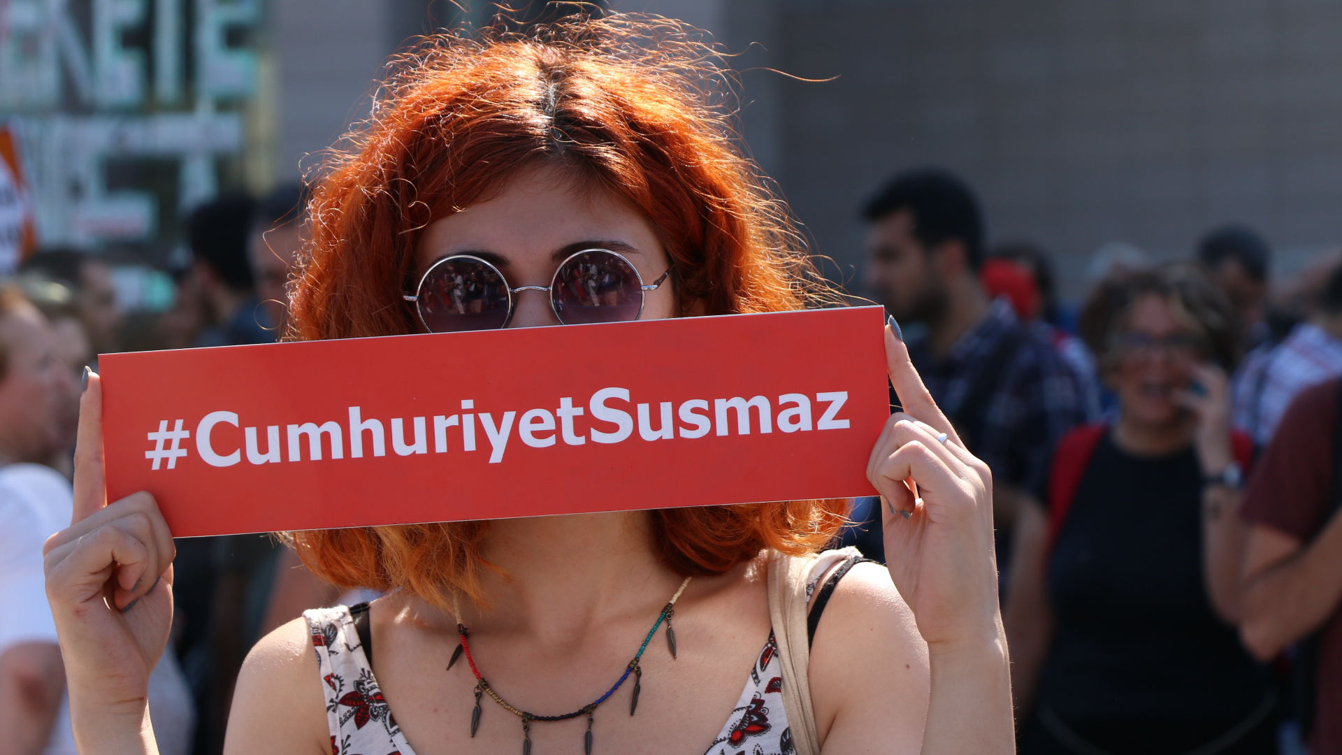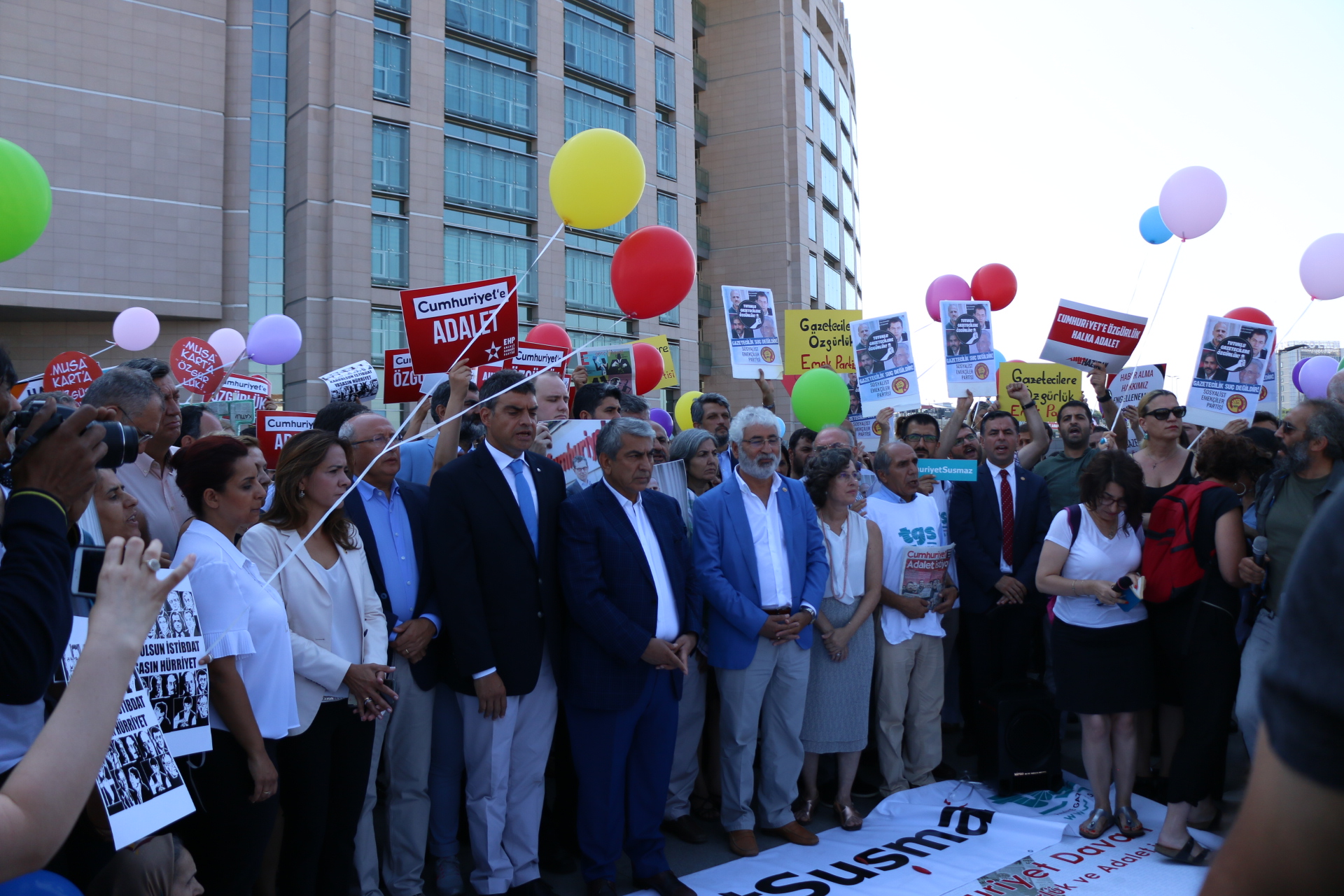 PİRHA-Aralarında gazetenin eski Genel Yayın Yönetmeni Can Dündar, halefi Murat Sabuncu, yayın danışmanı Kadri Gürsel ve muhabir Ahmet Şık’ın da olduğu, 17’si Cumhuriyet çalışanı 19 kişi, aylar sonra Çağlayan’daki İstanbul 27’inci Ağır Ceza Mahkemesi’nde yargılanıyor. İçeride gazeteciler yargılanırken, ‘Dışarıdaki Gazeteciler’ inisiyatifi de dayanışma etkinliği düzenledi. Etkinlikte gazetecilere özgürlük sloganları atarak, gökyüzüne balonlar bıraktılar.