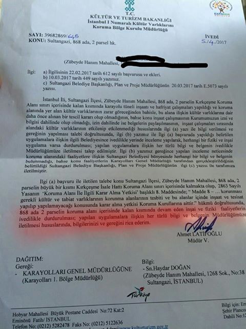 Alevi ve Kürt nüfusun yoğunlukta olduğu Gazi semti, Zübeyde Hanım Mahallesi’nde Acele kamulaştırma kararından sonra halkın tarihi eserleri koruma kuruluna verdiği dilekçeler sonucu, Kültür ve Turizm Bakanlığı İstanbul 1 Numaralı Kültür Varlıklarını Koruma Bölge Kurulu Müdürlüğü tarafından Karayolları Genel Müdürlüğüne “ivedi” ibaresiyle gönderilen kararda, “İstanbul İli Sultangazi İlçesi Zübeyde Hanım Mahallesi 868 Ada 2 Parselin Kırkçeşme Koruma alanı sınırları içinde kalan kısımında karayollu tüneli inşaatı ve faliyet çalışmaları yapıldığı ve koruma alanında yer alan Kültür varlıklarının etkilenip etkilenmeyeceğinin saptanması için çalışmayı durdurma kararı aldı” denildi.