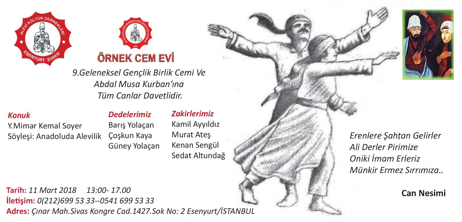 11 Mart Pazar günü saat 13:00 ile 17:00 arası düzenlenecek olan birik cemi ve Abdal Musa kurbanının 9’uncusu düzenleniyor. Ayrıca cemin ardından “Anadolu’da Alevilik” başlığı altında bir söyleşi de yapılacak.