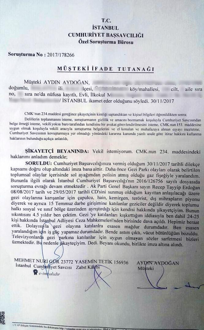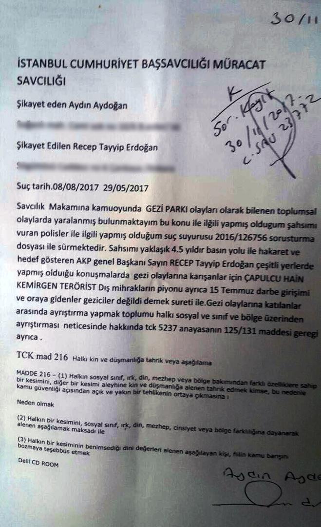 Bir akşam yine televizyonda Gezicilere hakaret içeren söylemlerde bulunduğunu ve yeter artık deyip, sabah suç duyurusunda bulunmaya karar verdiğini söyleyen Aydın Aydoğan, “Erdoğan’ın hakaret ettiği bütün konuşmalarını CD’ye kopyalayıp, Anayasanın 129. Maddesine göre dilekçemi yazdım ve savcılığa gittim” dedi.
