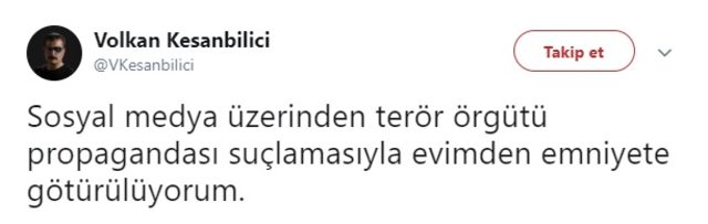 Gezi Şehit ve Gazileri Platformu Sözcüsü Volkan Kesanbilici , gözaltına alındığını “Sosyal medya üzerinden terör örgütü propagandası suçlamasıyla evimden emniyete götürülüyorum.” ifadeleriyle duyurdu.