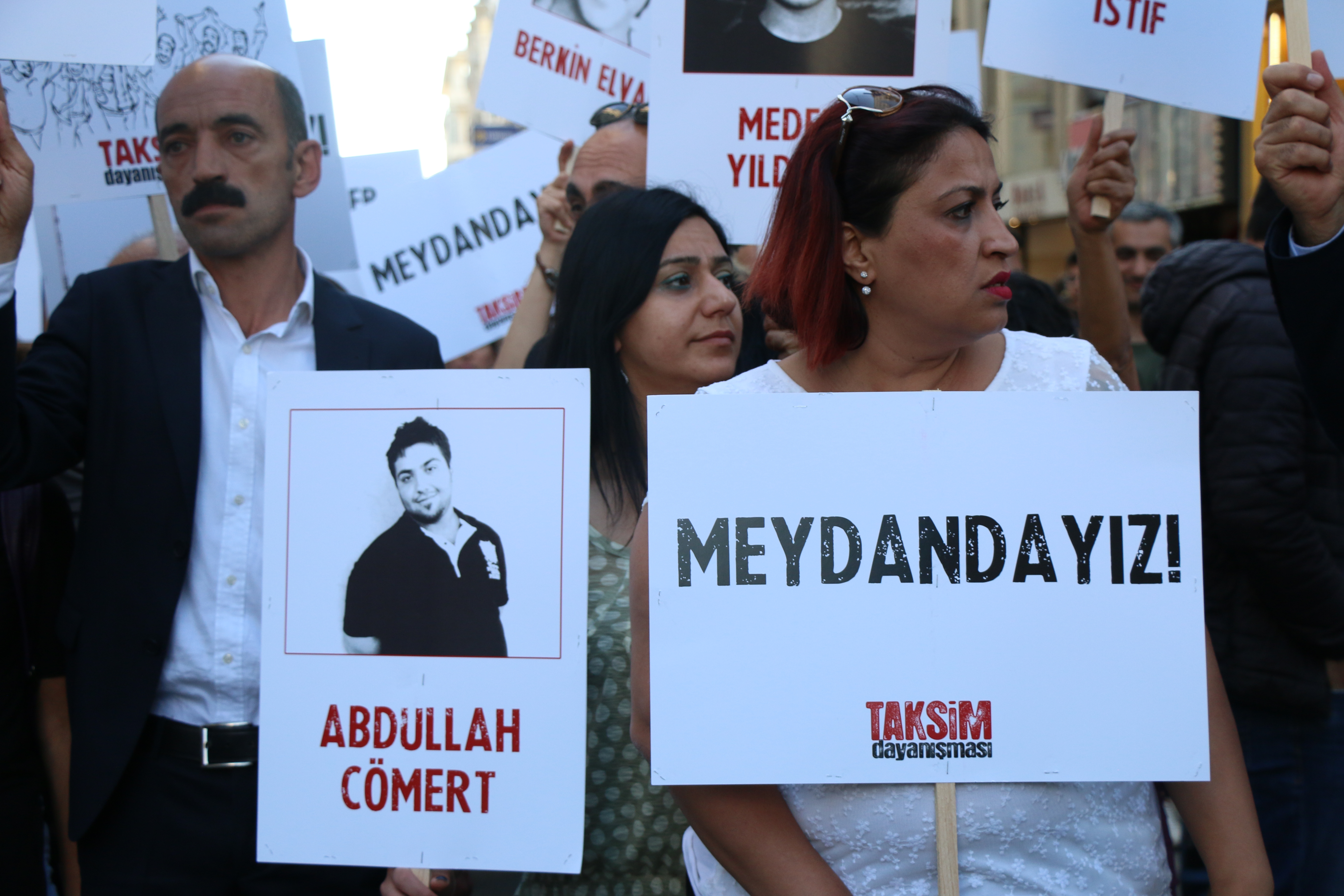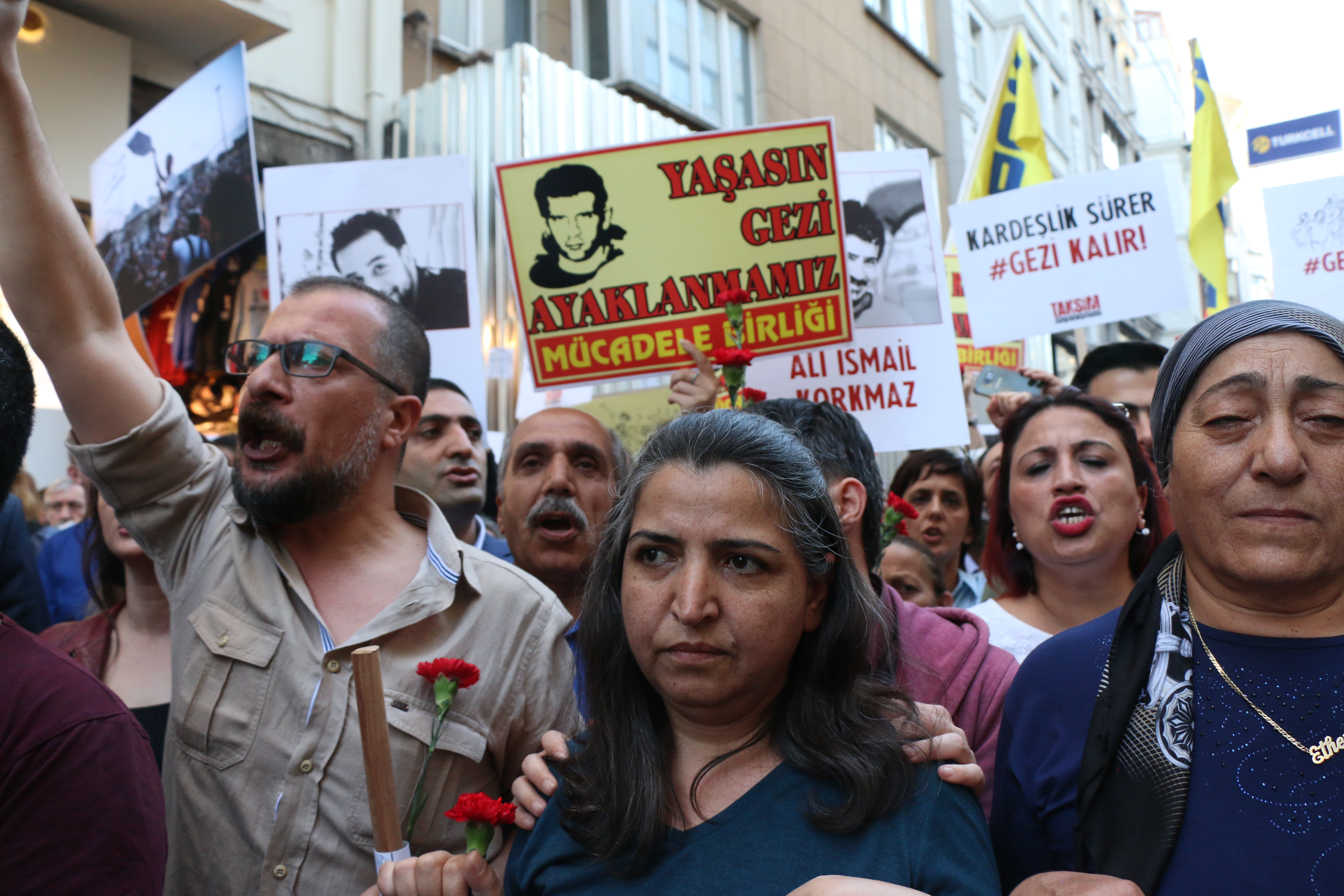 Gezi eylemlerinde hayatını kaybedenler ve yaralananlar için Taksim Dayanışması’nın çağrısıyla düzenlenen anma etkinliğinin Taksim Meydanı’nda yapılmasına polisin izin vermemesi nedeniyle Fransız Kültür Merkezi önünde yapıldı. Anma etkinliğine Taksim Dayanışması bileşenleri, siyasi parti temsilcileri, Gezi’de yaşamanı yitiren Berkin Elvan’ın annesi Gülsüm Elvan, Ali İsmail Korkmaz’ın annesi Emel Korkmaz ile ağabeyi Gürkan Korkmaz, Ethem Sarısülük’ün annesi Sayfi Sarısülük, Medeni Yıldırım’ın annesi Fahriye Yıldırım, Hasan Ferit Gedik’in annesi Nuray Gedik, Mehmet Ayvalıtaş’ın babası Ali Ayvalıtaş, EMEP Genel Başkan Yardımcısı Levent Tüzel, CHP Milletvekilleri Ali Şeker, Sezgin Tanrıkulu, CHP İstanbul İl Başkanı Canan Kaftancıoğlu, HDP İl Eş Başkanı Esengül Demir, HDP Milletvekili Adayı Oya Ersoy, DİSK Genel Başkanı Arzu Çerkesoğlu’nun da aralarında olduğu yüzlerce kişi yoğun ablukaya rağmen Taksim Makina Mühendisleri Odası önünde bir araya geldi.
