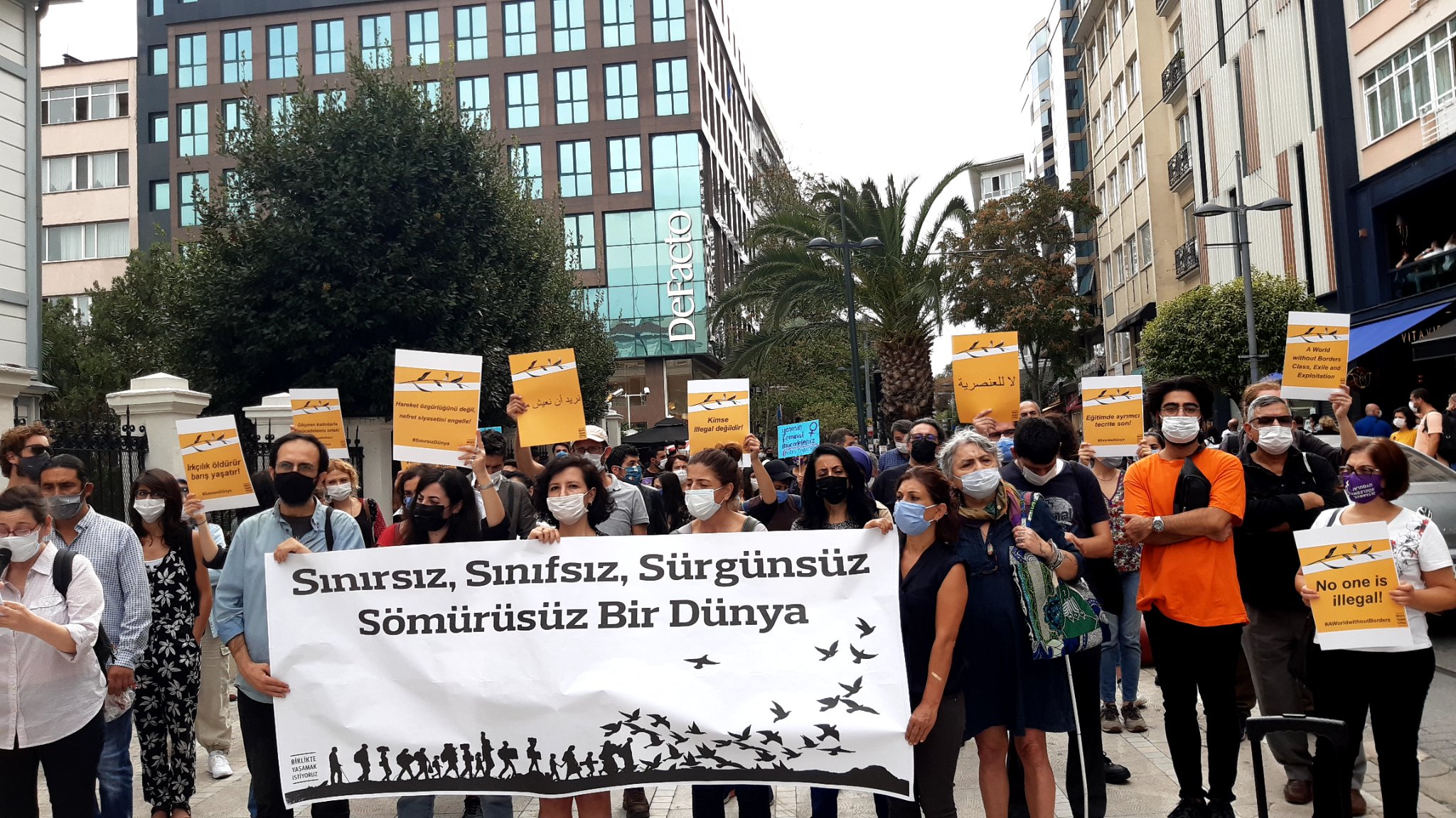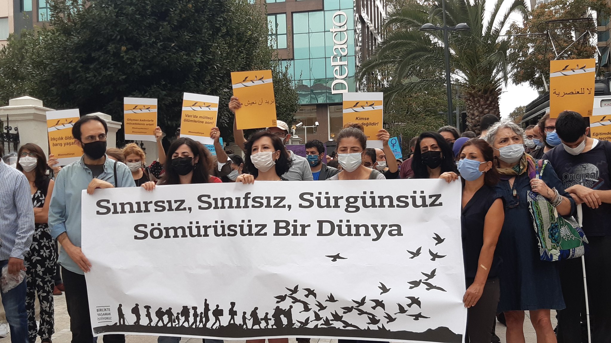 Halkların Demokratik Partisi (HDP) Milletvekili Züleyha Gülüm, İstanbul İl Eş Başkanı Elif Bulut, İnsan Hakları Derneği (İHD) İstanbul Şubesi Başkanı Gülseren Yoleri ve çok sayıda kişi katıldığı açıklamayı okuyan Birlikte Yaşamak İstiyoruz İnsiyatifi üyesi Deniz Şensöz, dünyanın dört bir yanında binlerce kişinin mülteciler için sokağa çıktığını belirttti.