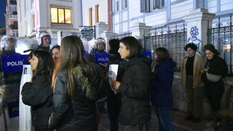 İzmir ve İstanbul’da sosyalistlere yönelik operasyonda Sosyalist Kadın Meclisleri (SKM) Genel Sözcüsü Tanya Kara, SKM Merkez Yürütme Kurulu (MYK) üyesi Ezgi Gürbüz, Genel Meclis üyeleri Meliha Kayacı ve Hacer Elçin’in gözaltına alınmasını protesto etmek isteyen çok sayıda kadın Kadıköy Süreyya Operası önünde buluştu.