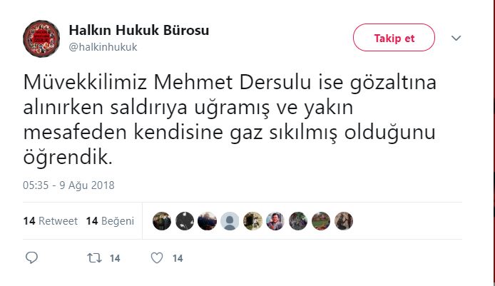 “Müvekkilimiz Nuriye Gülmen’in sağlık kontrolleri için hastaneye götürülürken polisler tarafından saldırıya uğradığını öğrendik. Sol bacağında kırık olması ihtimali var. Müvekkilimiz Mehmet Dersulu ise gözaltına alınırken saldırıya uğramış ve yakın mesafeden kendisine gaz sıkılmış olduğunu öğrendik.”